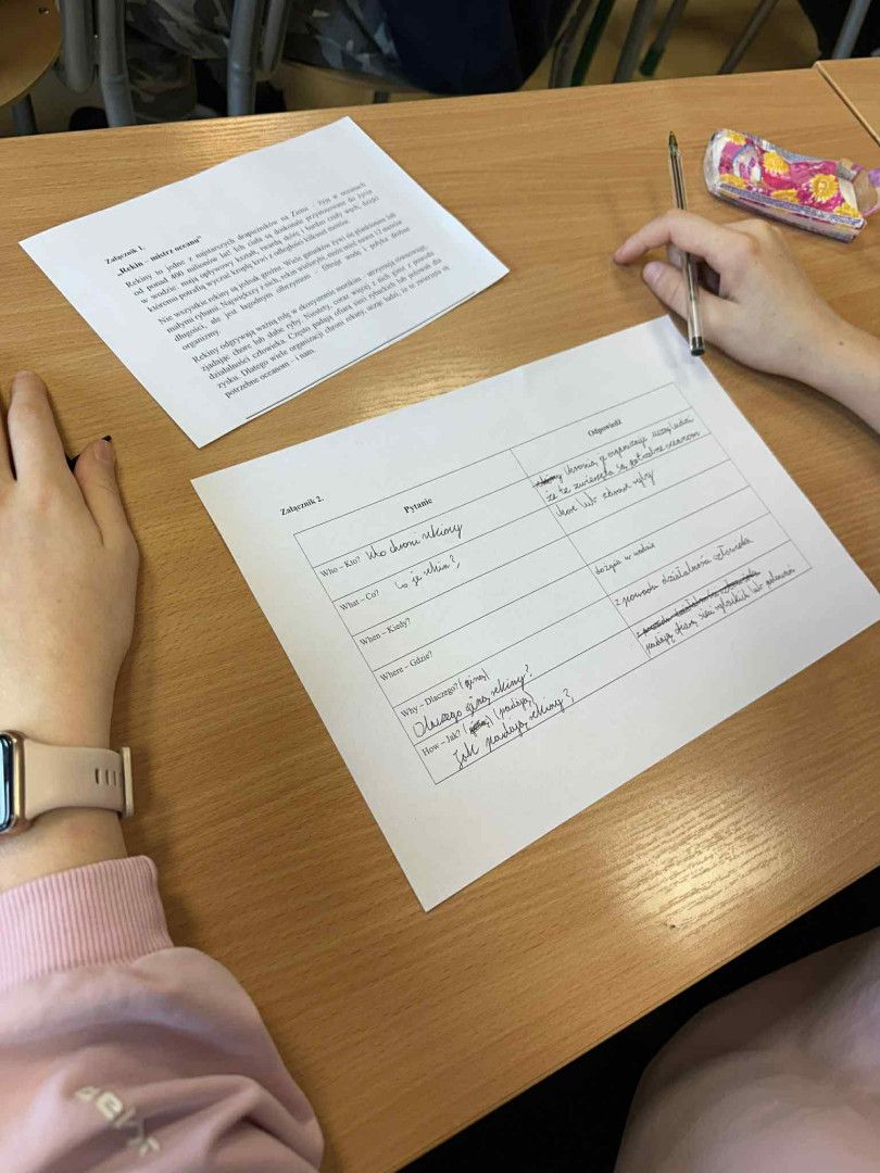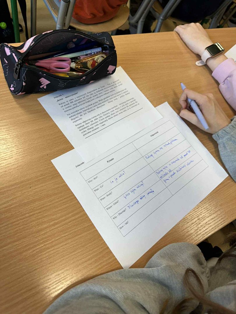 Uczniowie poznali technikę zadawania pytań 5W+H (Who? What? When? Where? Why? How?). Po zapoznaniu się z prezentacją pokazującą działanie 5W+H, analizowali fragment tekstu popularnonaukowego, stosując sześć kategorii pytań. Doszli do wniosku, że odpowiednie pytania pomagają w lepszym zrozumieniu tekstu, zadania lub problemu.