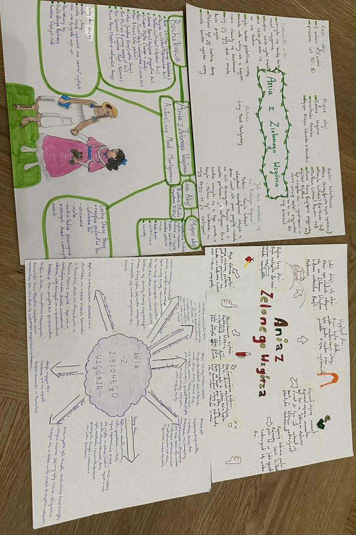 Podczas zajęć uczniowie tworzyli mapę myśli na podstawie lektury uzupełniającej „Ania z Zielonego Wzgórza”. Pracując z tekstem, porządkowali najważniejsze informacje dotyczące bohaterów, wydarzeń, miejsc oraz cech głównej postaci. Dzięki tej metodzie uczyli się selekcjonować informacje, dostrzegać związki między nimi oraz zapamiętywać treści w sposób wizualny i uporządkowany.