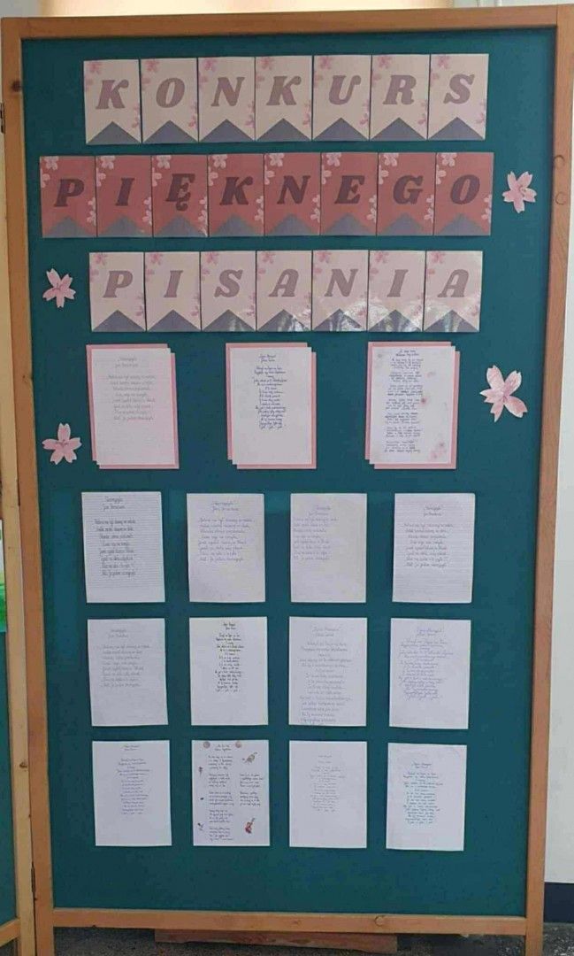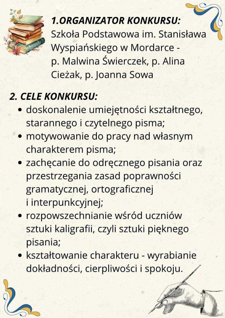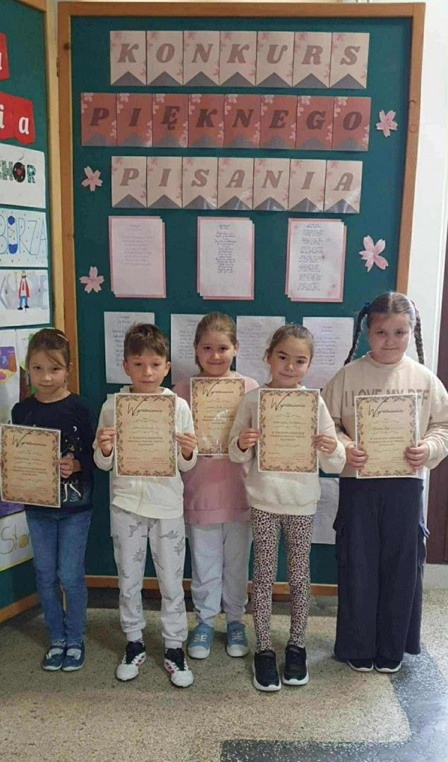 2. Konkurs pięknego pisania Mistrz Kaligrafii z wystawą prac i nagrodami. Otrzymałyśmy 96 prac. Wybór najlepszych z nich był niezwykle trudny, ponieważ wszyscy uczniowie bardzo starannie, a wręcz po mistrzowsku przepisali konkursowy tekst. O zwycięstwie decydowały dosłownie szczegóły. Ostatecznie tytuł Mistrza Kaligrafii w roku szkolnym 2025/2026 otrzymali: