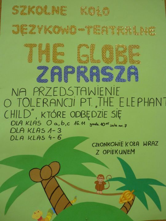 Z okazji europejskiego dnia języków obcych członkowie koła językowo-teatralnego ‘’The Globe” przygotowali przedstawienie na temat tolerancji. Przedstawienie przygotowane przez uczniów klas piątej i szóstych nosiło tytuł ‘’The elephant’s child”. Scenariusz przedstawienia został oparty na opowiadaniu Rudyarda Kiplinga pod tym samym tytułem a obejrzeli je uczniowie klas od 0 do VI szkoły podstawowej.