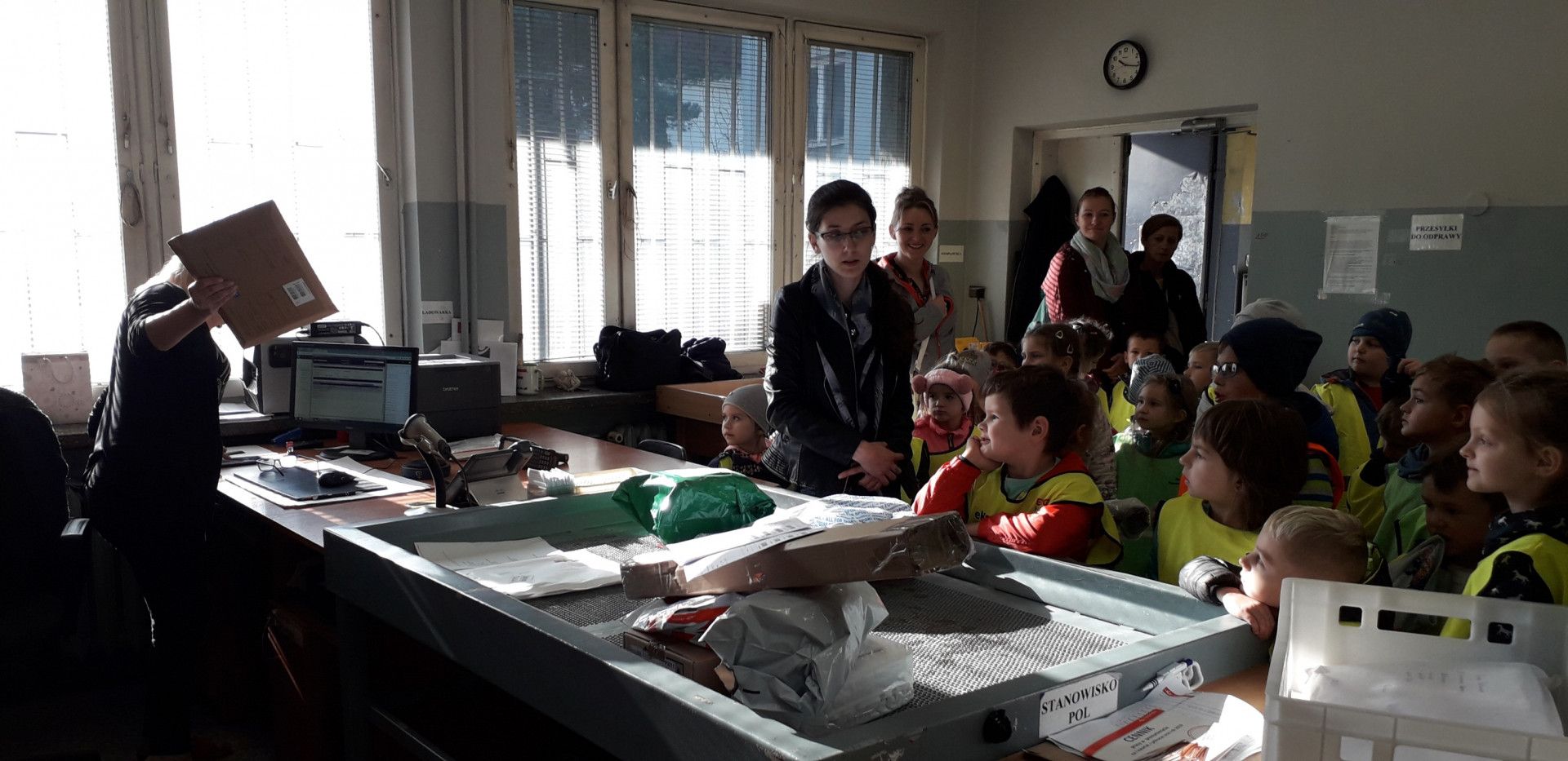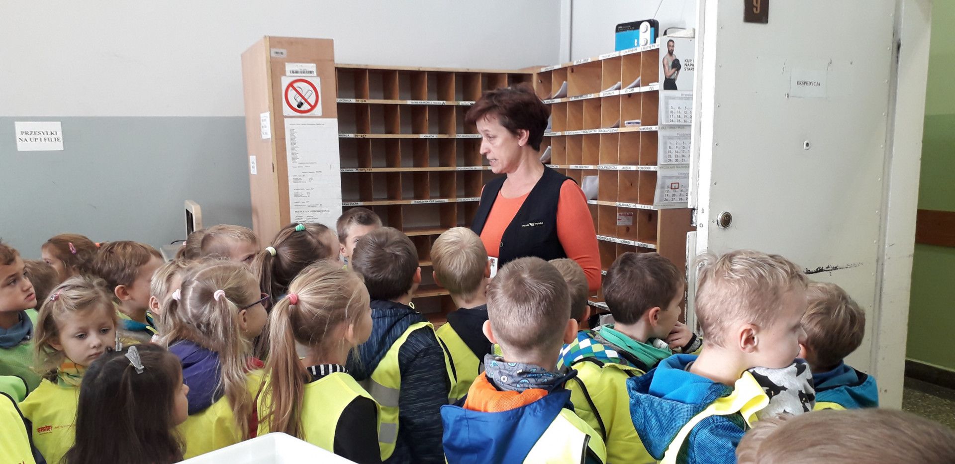 W drodze powrotnej odwiedziliśmy Urząd Pocztowy w Limanowej. Panie pracujące na Poczcie zapoznały nas zarówno ze swoją pracą, jak i z pracą listonoszy. Dzieci dowiedziały się co kryje się w skrytkach pocztowych, kto z nich korzysta oraz, że każdy właściciel takiej skrytki ma „specjalny” kluczyk, by dostać się do listu lub przesyłki. Zobaczyliśmy także miejsca, do których nieupoważnione osoby nie mają dostępu. Dzięki uprzejmości pracowników dzieci mogły zobaczyć gdzie sortowane są listy i paczki oraz w jakie miejsca (półki) trafiają, aby listonosze mieli do nich prosty dostęp i mogli każdego ranka zacząć swoją pracę.