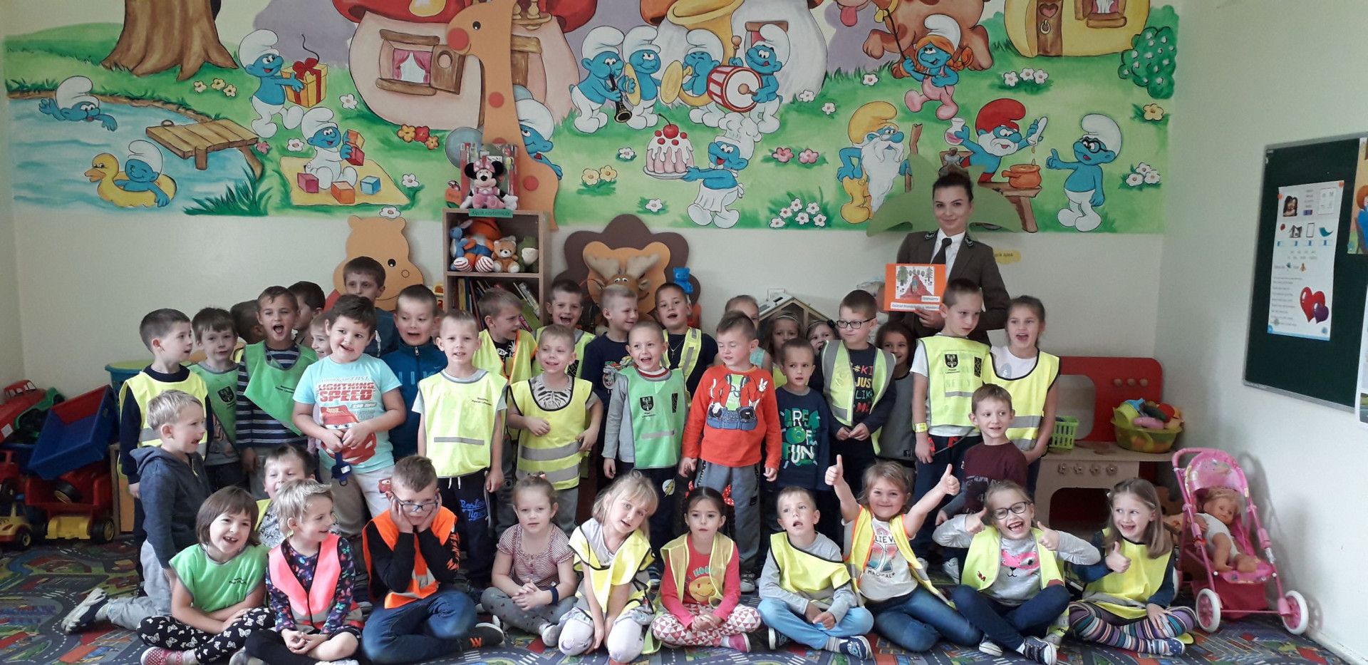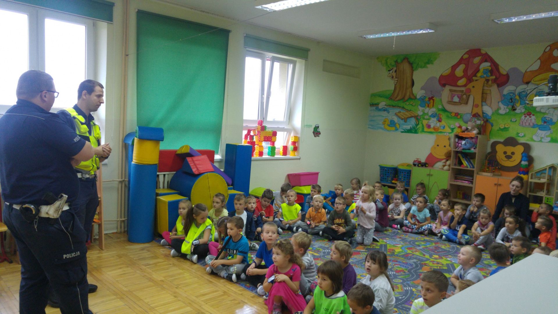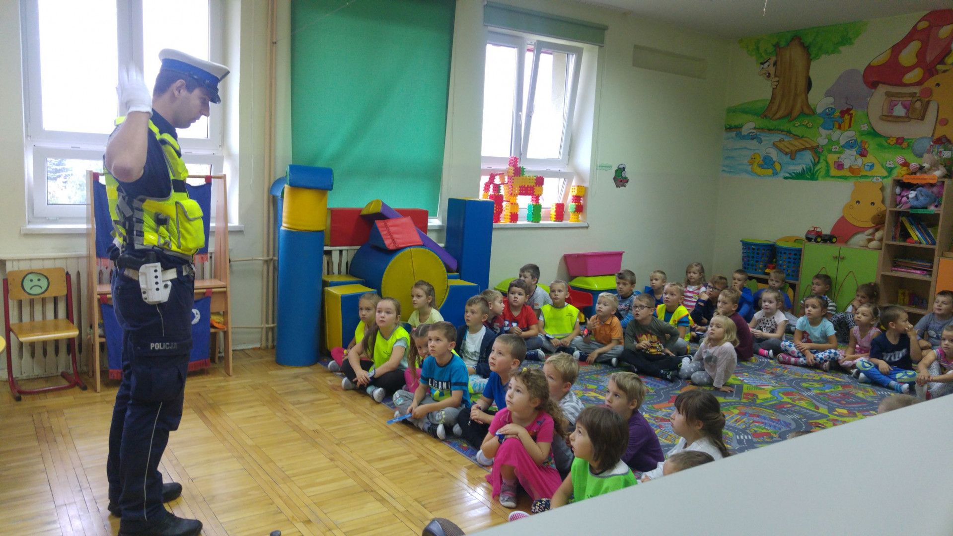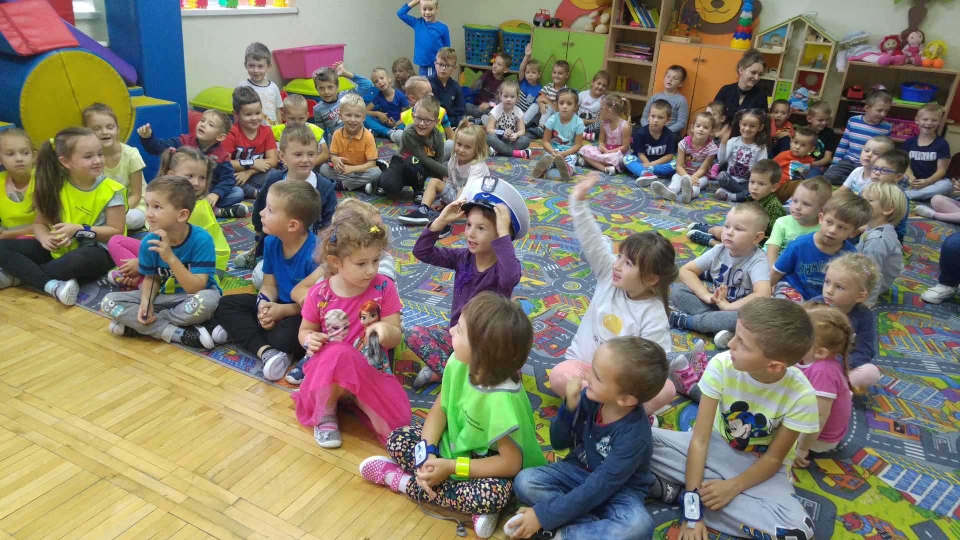 We wrześniu mówiliśmy o bezpiecznym zachowaniu na drodze. Odbyliśmy liczne spacery i odwiedzili nas Panowie POLICJANCI, którzy opowiedzieli nam o swojej pracy – czego dzieci słuchały z zaciekawieniem. Panowie pokazali dzieciom kajdanki i swoje czapki, które dzieci mogły przymierzyć. Przypomnieli mam również jak należy poruszać się po drodze i nauczyli nas jak prawidłowo przechodzić przez jezdnię. ,,Niema to jak przechodzić przez pasy z Panem POLICJANTEM” – powiedziały dzieci i obiecały, że w drodze do szkoły i ze szkoły do domu będą nosić odblaski.