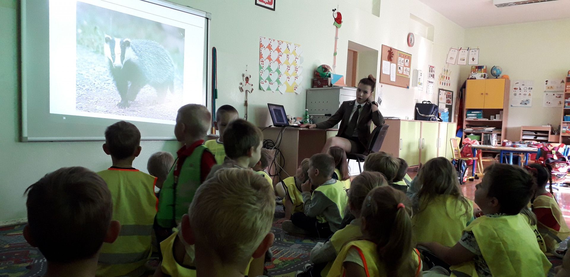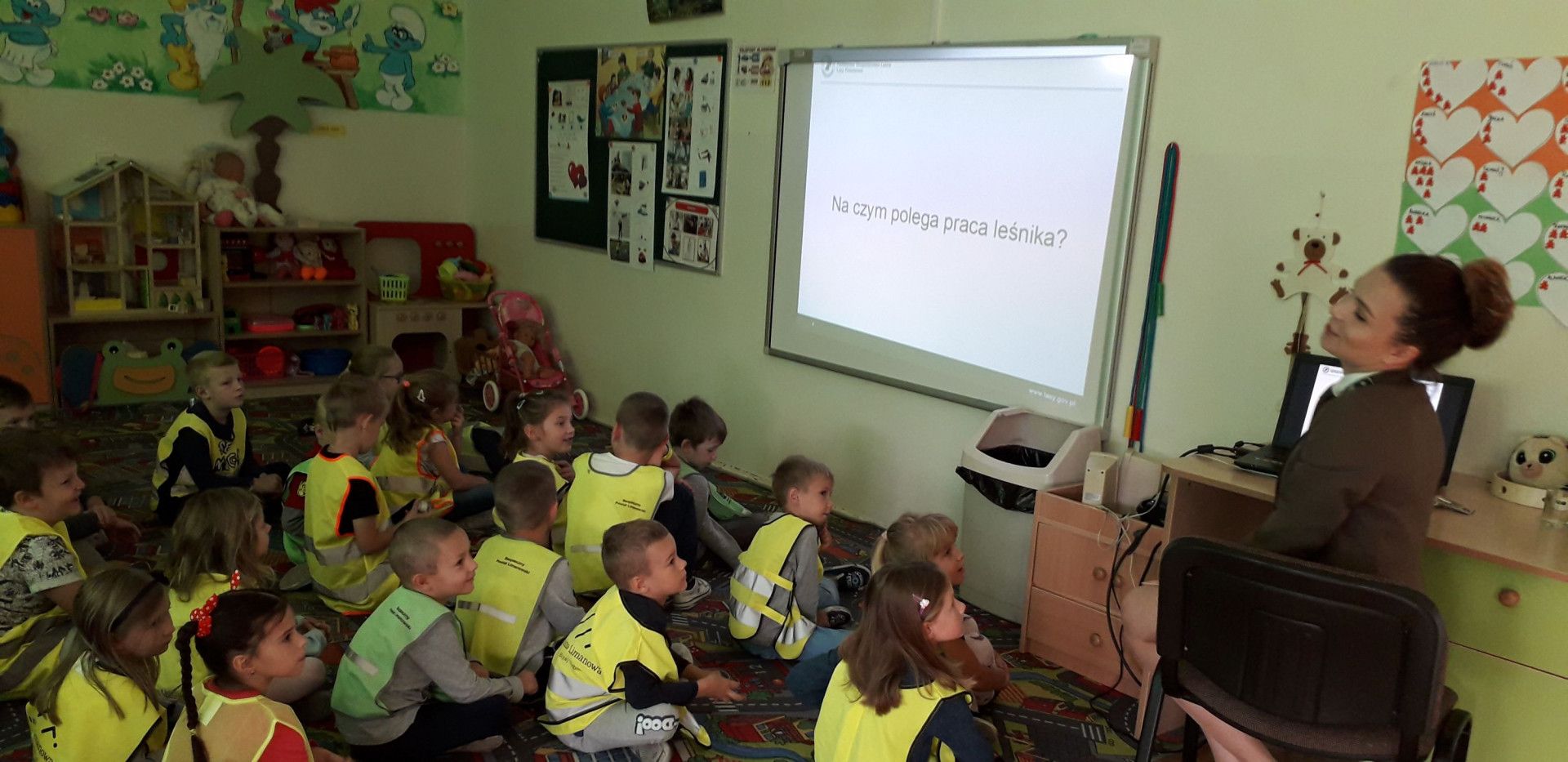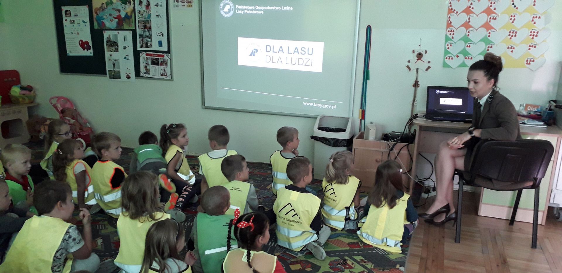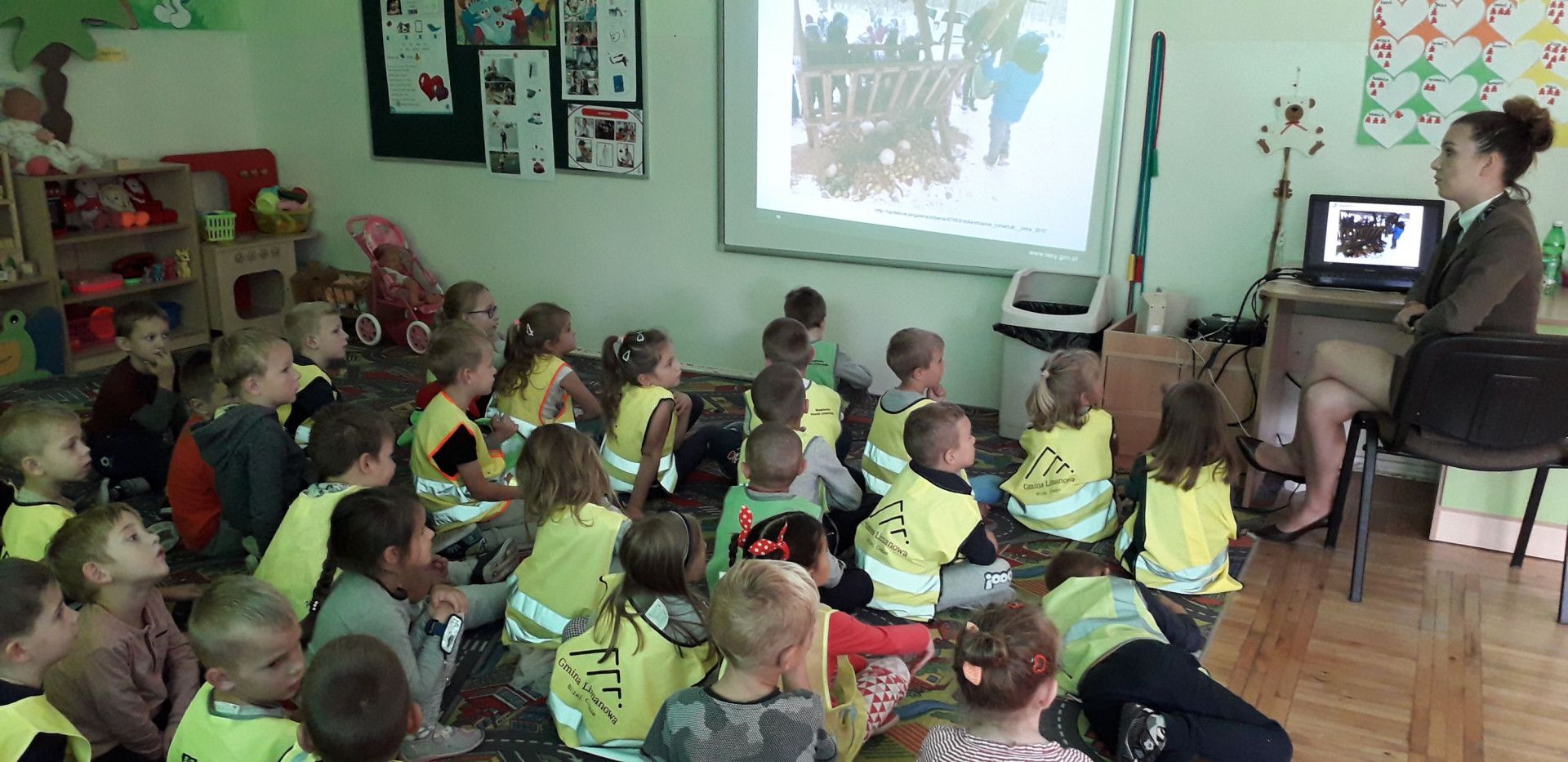W dniu 18 października odwiedziła nas Pani Magdalena – leśniczy z Nadleśnictwa w Limanowej. Dzieci z niecierpliwością czekały na to spotkanie, bo kto jak nie Pani leśniczy wie o lesie i jego mieszkańcach najlepiej? Droga do lasu z naszej szkoły jest daleka, więc każde dziecko pamięta o noszeniu odblasków. Maluchy zapoznały się z pracą leśniczego oraz dowiedziały się wielu ciekawych informacji na temat lasu. Po wizycie wszystkie przedszkolaki doskonale już wiedzą na czym polega praca w takim zawodzie, co wolno w lesie, a czego należy się wystrzegać, by nie szkodzić drzewom i mieszkańcom lasu. Na pożegnanie maluchy wręczyły Gościowi wcześniej przygotowany obrazek.