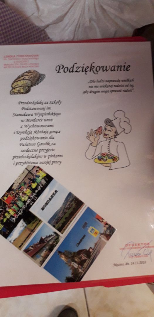 Serdeczne podziękowania od dzieci i wychowawców składamy na ręce właścicieli piekarni Państwa Gawlik oraz wspaniałej załogi, która w interesujący i przemiły sposób przybliżyła najmłodszym uczniom szkoły w Mordarce, swoją pracę i funkcjonowanie piekarni.