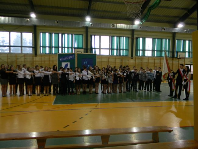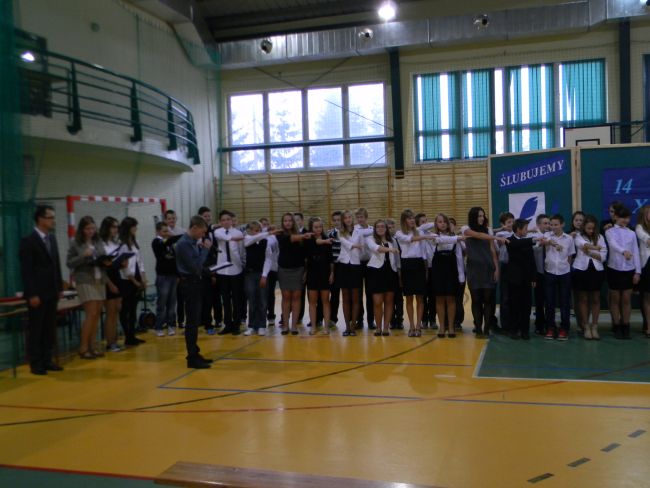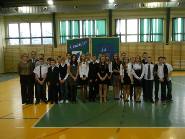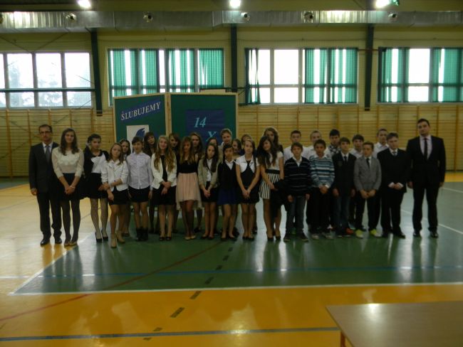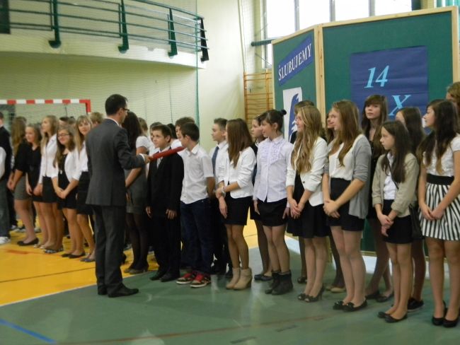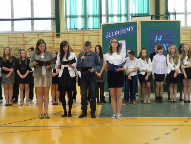 W dniu 14 października odbyło się również ślubowanie uczniów klas pierwszych gimnazjum. W uroczystości uczestniczyli: Dyrekcja, Grono Pedagogiczne,  a także pozostali uczniowie gimnazjum. Podczas części oficjalnej młodzież złożyła uroczyste ślubowanie na sztandar szkoły. Uczniowie klasy IA i IB zobowiązali się :