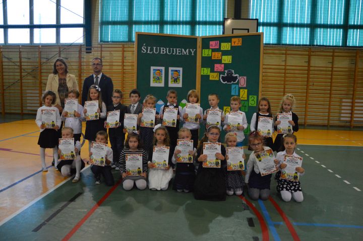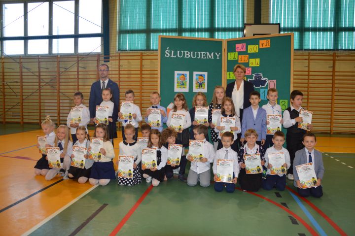 Dnia 12 października 2017 roku w naszej szkole odbyło się uroczyste ślubowanie klas pierwszych. W uroczystości udział wzięli: dyrekcja szkoły, rodzice pierwszoklasistów oraz nauczyciele i uczniowie klas 0 - III. Po powitaniu zebranych gości, uczniowie pod okiem pań wychowawczyń zaprezentowali swoje umiejętności recytatorskie i wokalne. W trakcie uroczystości pierwszoklasiści wykazali się znajomością symboli narodowych, obowiązków ucznia oraz zachowania się na przejściu dla pieszych. Potem uczniowie złożyli na Sztandar Szkoły uroczystą przysięgę.