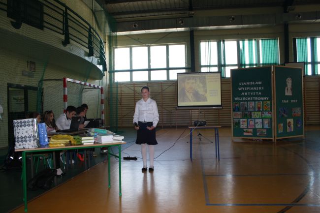 Uroczystej akademii przewodniczyła Anna Czachura z klasy IV a wspierana przez koleżanki z tej samej klasy - Weronikę Król i Gabrielę Jasicę, które odczytały prezentację multimedialną o naszym patronie. Przedstawiły w niej biografię i dorobek artystyczny Wyspiańskiego. Z przekazu można się było dowiedzieć, że był to człowiek wszechstronnie utalentowany - dramatopisarz, rysownik, poeta, malarz, projektant, dekorator. Publiczności szczególnie podobały się slajdy z obrazami i witrażami poety.