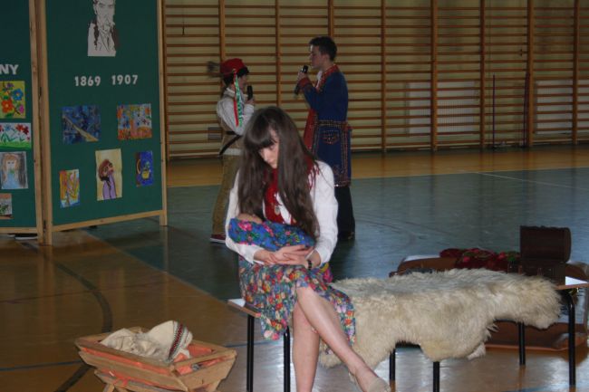 Później mogliśmy zobaczyć scenkę z „Wesela” Stanisława Wyspiańskiego brawurowo zagraną przez zespół „Didaskalki” z klasy IB w składzie: Iwona Tokarczyk, Wiktoria Duchnik, Kacper Łyszczarz, Aneta Kądziołka, Katarzyna Biernat i Natalia Wojtas. Uczniowie wystąpili w tradycyjnych strojach ludowych, posługiwali się gwarą ludową, dlatego ich występ wzbudził aplauz publiczności. Ciekawa scenografia, ale przede wszystkim świetna gra aktorów na pewno zapadła publiczności w pamięci.