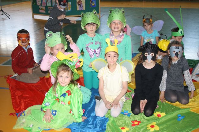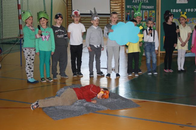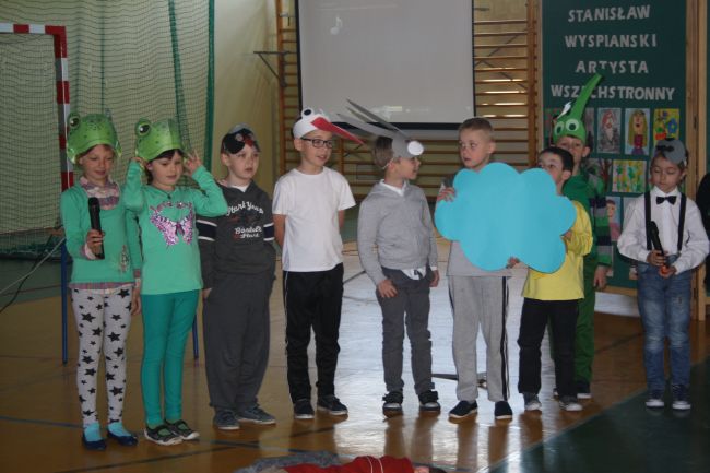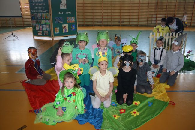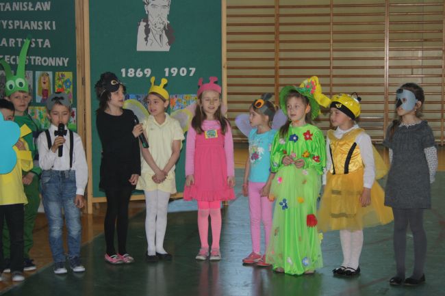 Na zakończenie wspaniale zaprezentowały się dzieci z klasy I b przygotowane przez p.Ewę Tomaszek przebrane za różne zwierzątka witające wiosnę. Na scenie zrobiło się barwnie, kiedy przybyła pani Wiosna i zapewne po tym wesołym występie z piosenką i tańcem już od nas nie odejdzie.