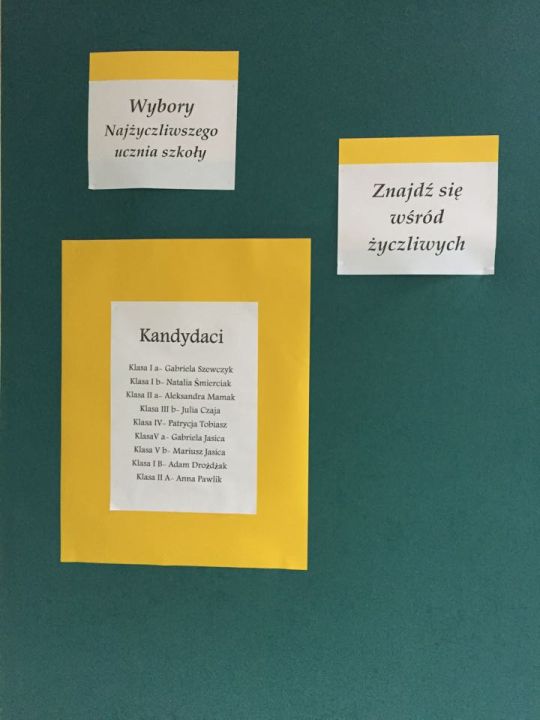 Tegoroczna akcja przebiegała pod hasłem „Znajdź się wśród życzliwych”. Ciekawym elementem była w tym dniu ŚCIANA ŻYCZLIWOŚCI I POZDROWIEŃ, na której każdy mógł umieścić dobre, miłe słowa, skierowane do konkretnej osoby lub do grupy, klasy itp. Tego dnia odbył się również plebiscyt na Najżyczliwszego ucznia. Zdecydowaną większością głosów wybrana została uczennica klasy II A gimnazjum Anna Pawlik. Serdecznie gratulujemy!