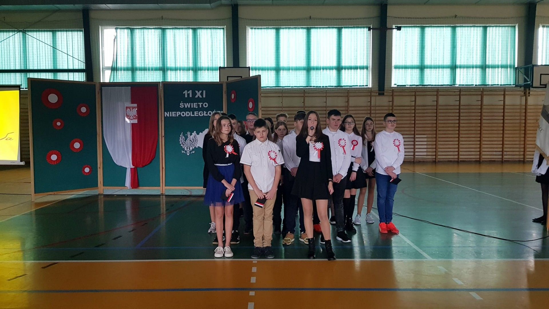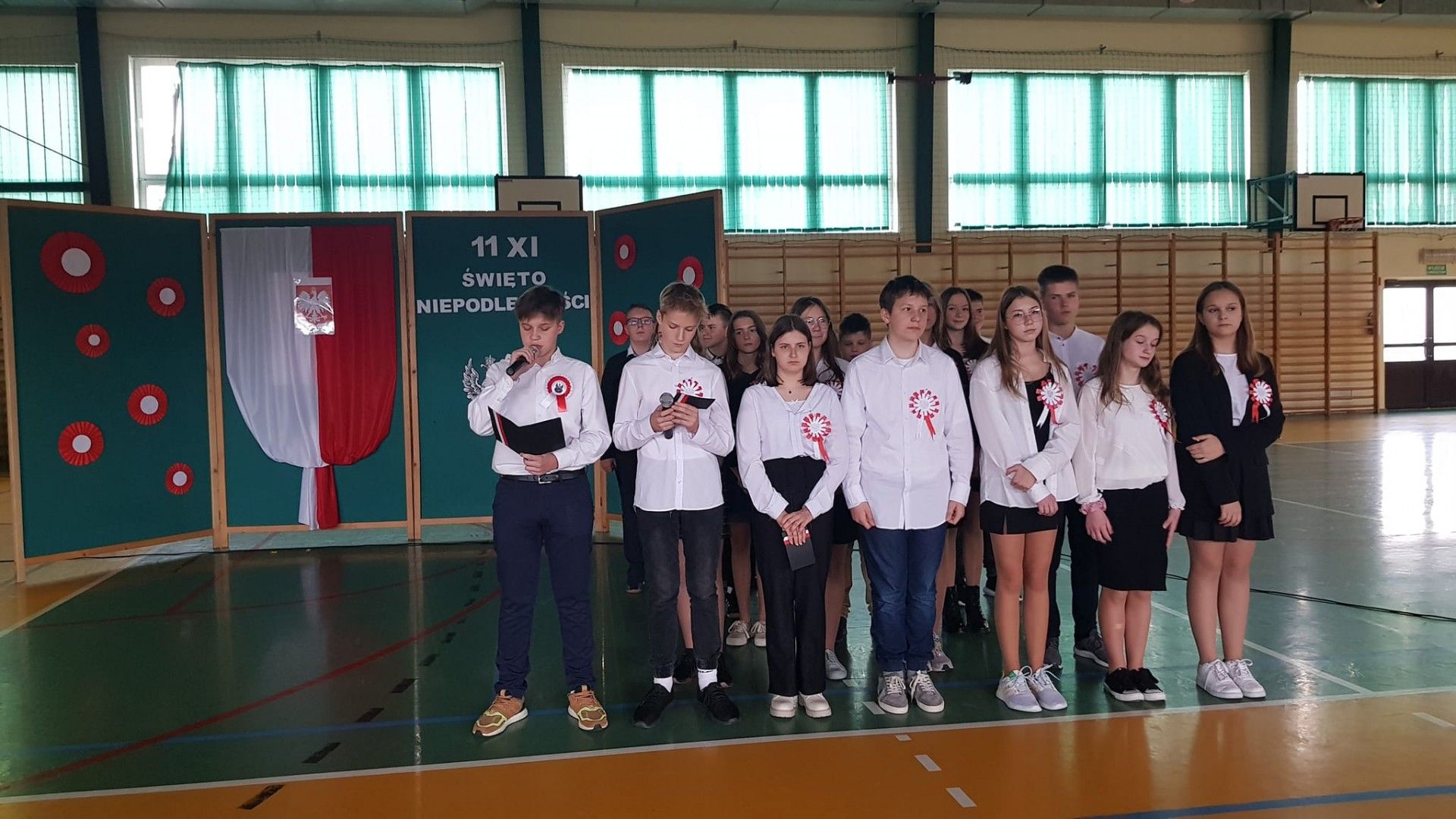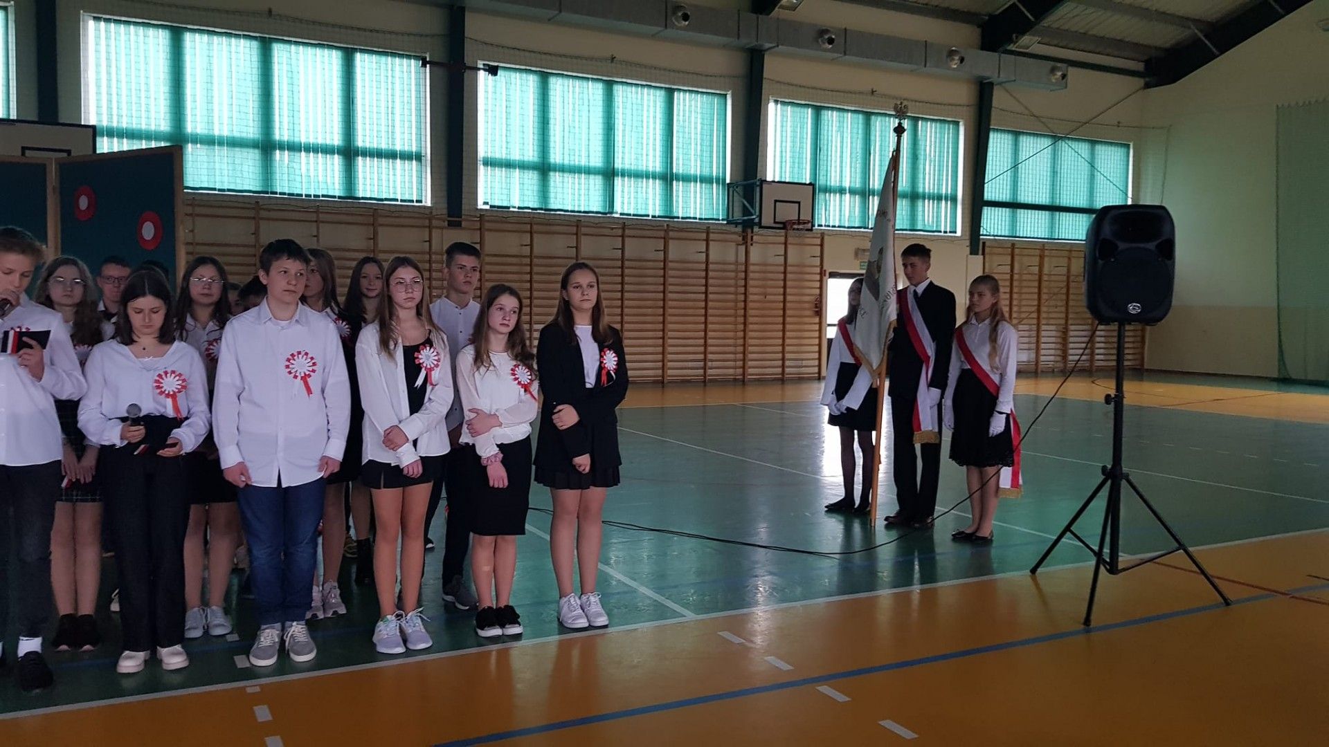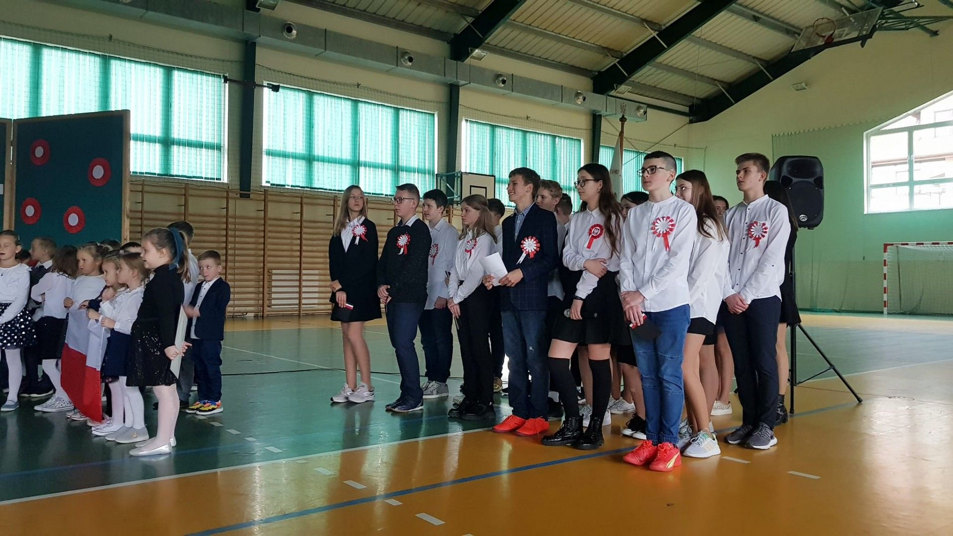 Kolejnym elementem obchodów tego święta był właśnie wspólny śpiew pod hasłem „Śpiewamy Tobie Ojczyzno”, który był przejawem miłości i gotowości do działań dla jej dobra. Nie można nie wspomnieć, że dało się odczuć drganie w hali sportowej wywołane dziesiątkami gardeł, z których wydobywał się piękny śpiew. Przykład dali nam tutaj najmłodsi uczniowie oddziału przedszkolnego i „zerówek” .