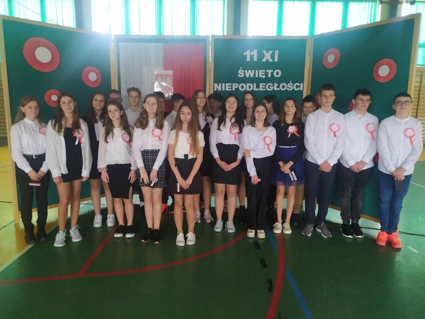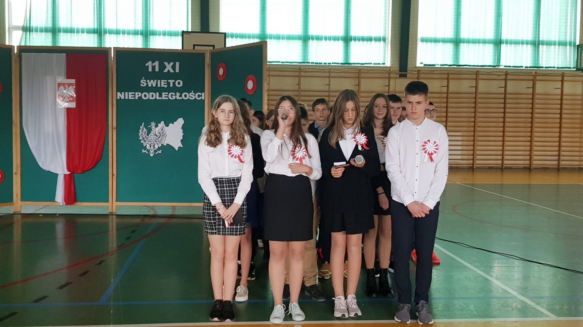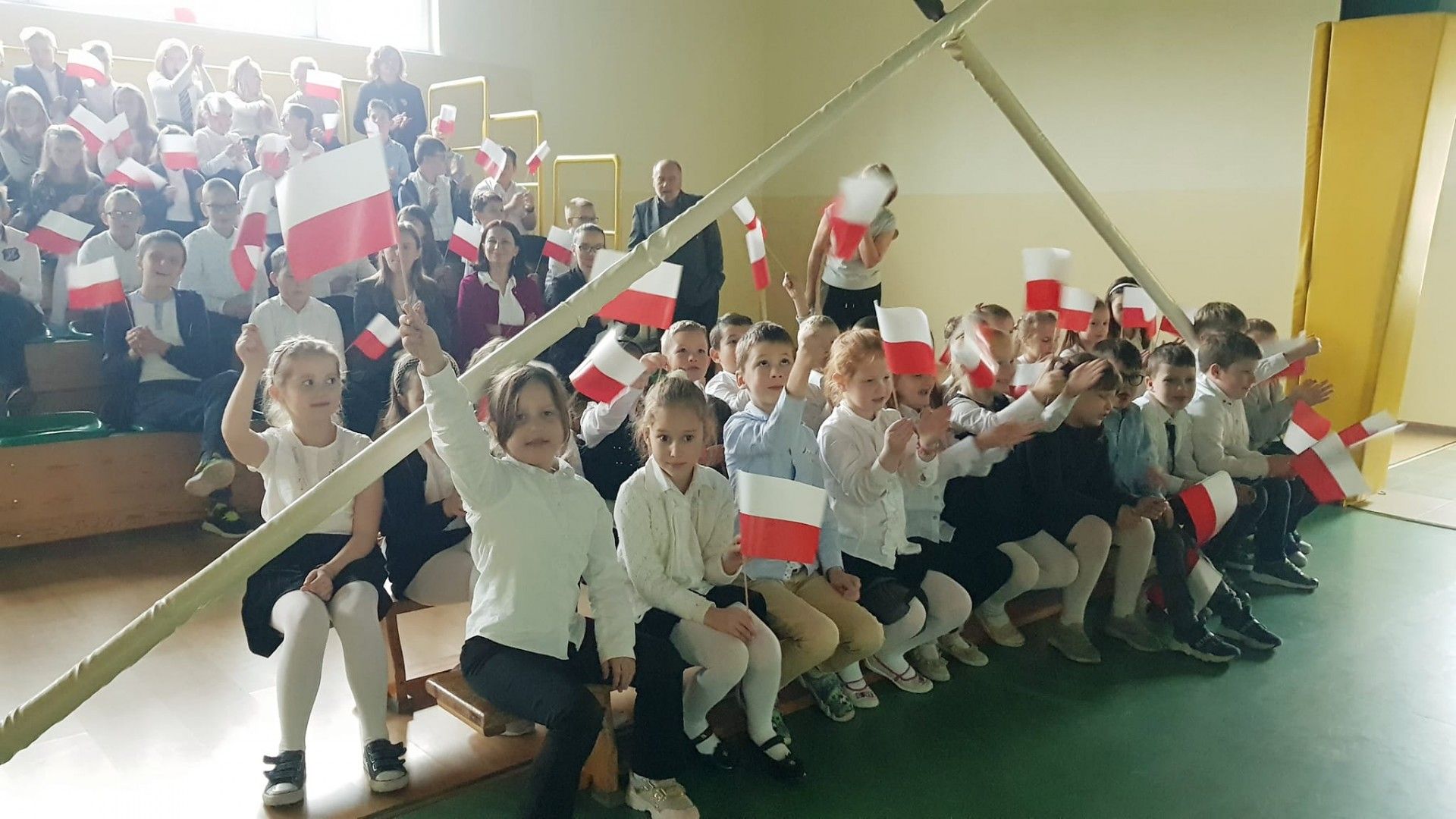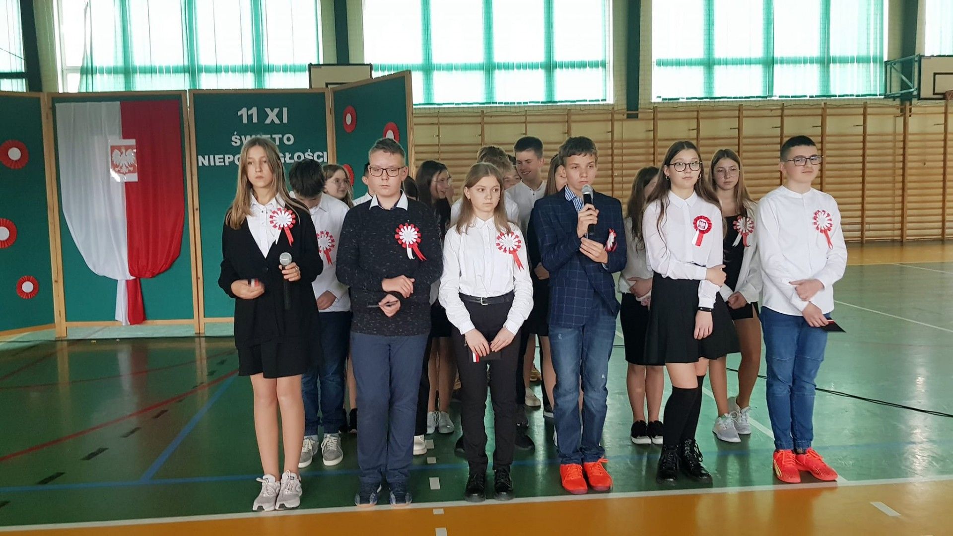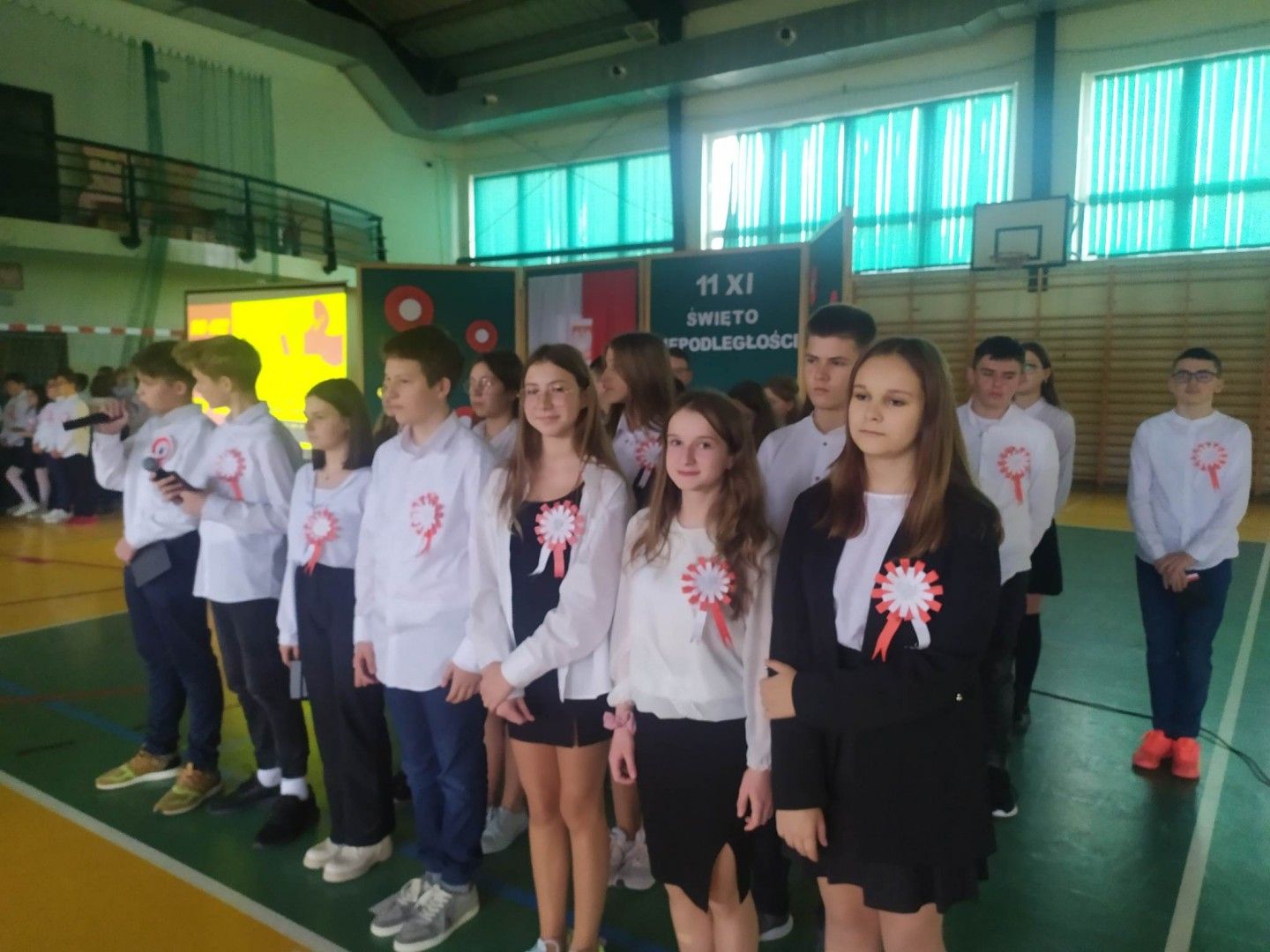Kolejnym elementem obchodów tego święta był właśnie wspólny śpiew pod hasłem „Śpiewamy Tobie Ojczyzno”, który był przejawem miłości i gotowości do działań dla jej dobra. Nie można nie wspomnieć, że dało się odczuć drganie w hali sportowej wywołane dziesiątkami gardeł, z których wydobywał się piękny śpiew. Przykład dali nam tutaj najmłodsi uczniowie oddziału przedszkolnego i „zerówek” .