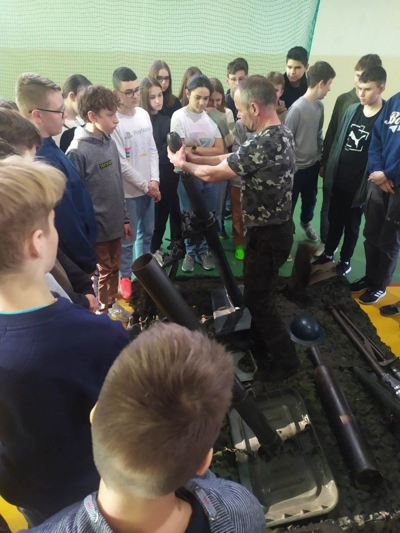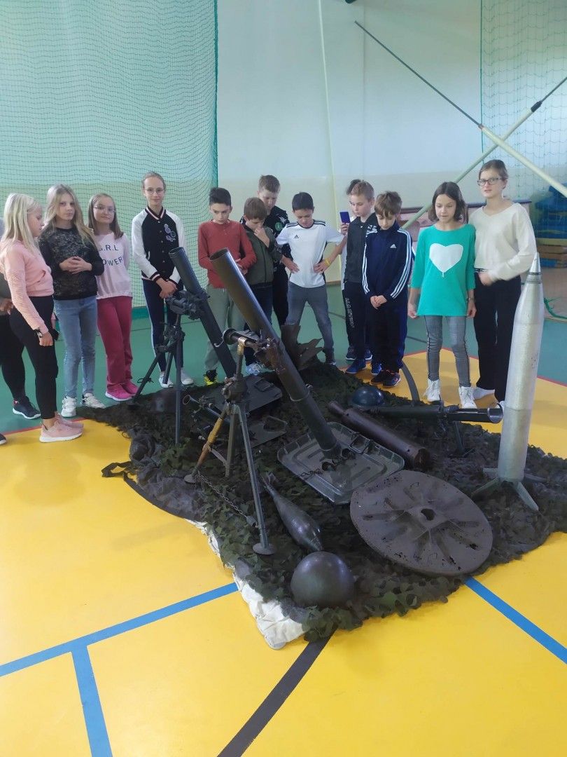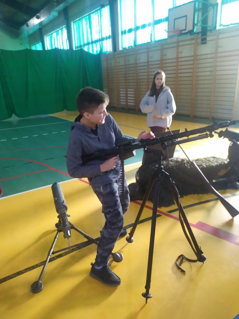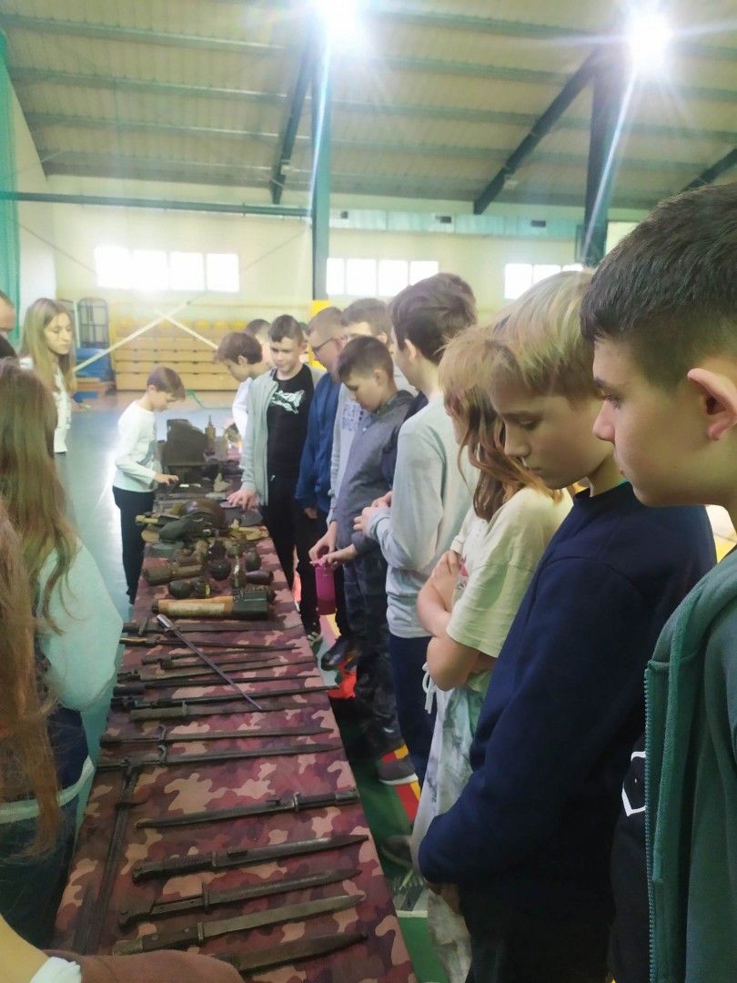Tegoroczną akcją w ramach obchodów „niepodległej” było także spotkanie w przededniu szkolnych obchodów z pasjonatem historii – Panem Rafałem Ardeckim, który zorganizował pokaz zgromadzonych eksponatów broni i amunicji szczególnie z okresu I wojny światowej i ciekawymi opowiadaniami przedstawił losy uczestników działań zbrojnych. To pozwoliło wszystkim wyobrazić sobie grozę wojny i zrozumieć, że wolność nie jest nam dana raz na zawsze , że ktoś może nam chcieć ją odebrać. Tak jak to dziś ma miejsce na Ukrainie. Uczniowie klasy 7 kończąc akademię prosili: