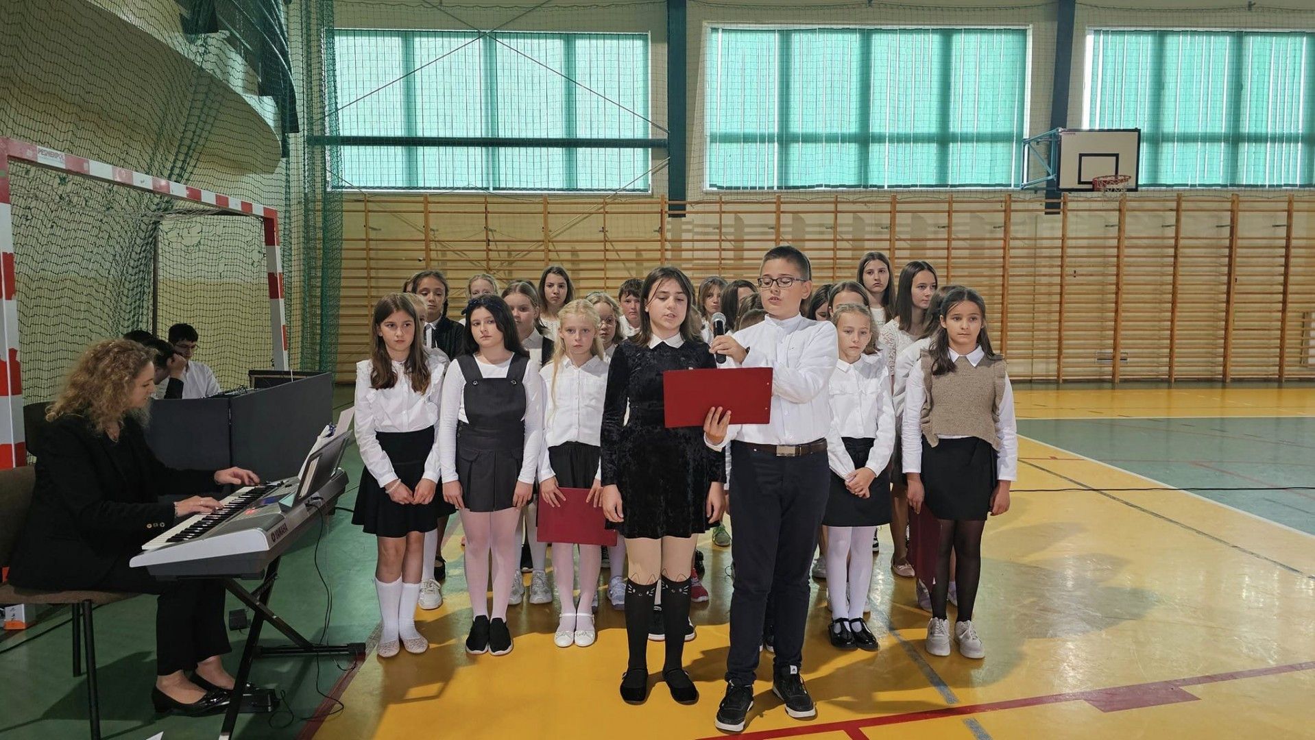 Siódmoklasistom towarzyszył także chór szkolny, który wzruszał wykonując pieśni patriotyczne np. takie jak „Biały Krzyż”. Konferansjerzy przypomnieli najważniejsze fakty i zwrócili uwagę na to, jak wielkie ofiary ponieśliśmy i jakim dramatem jest wojna. Na zakończenie cała społeczność szkolna uczciła pamięć poległych minutą ciszy.
