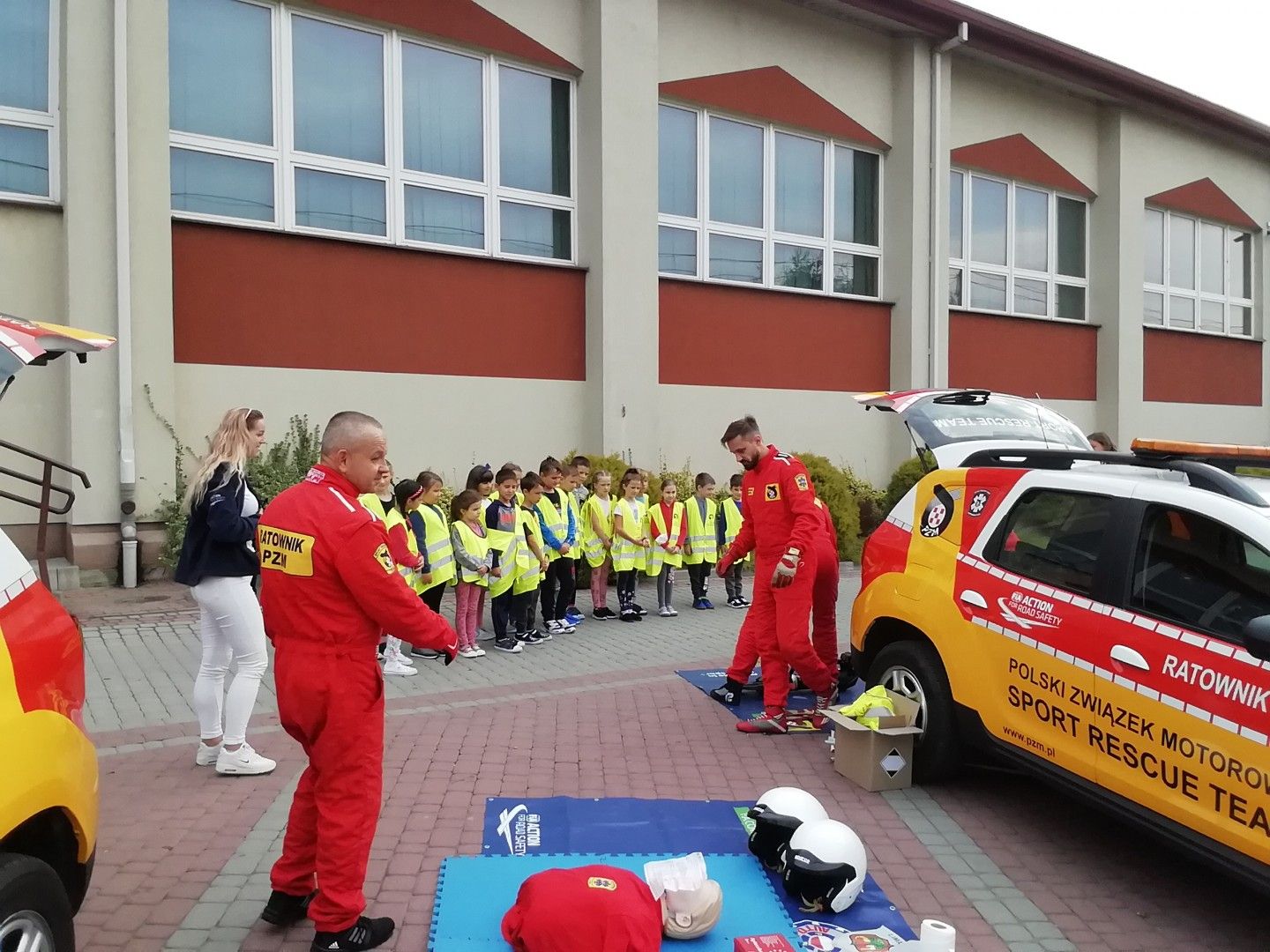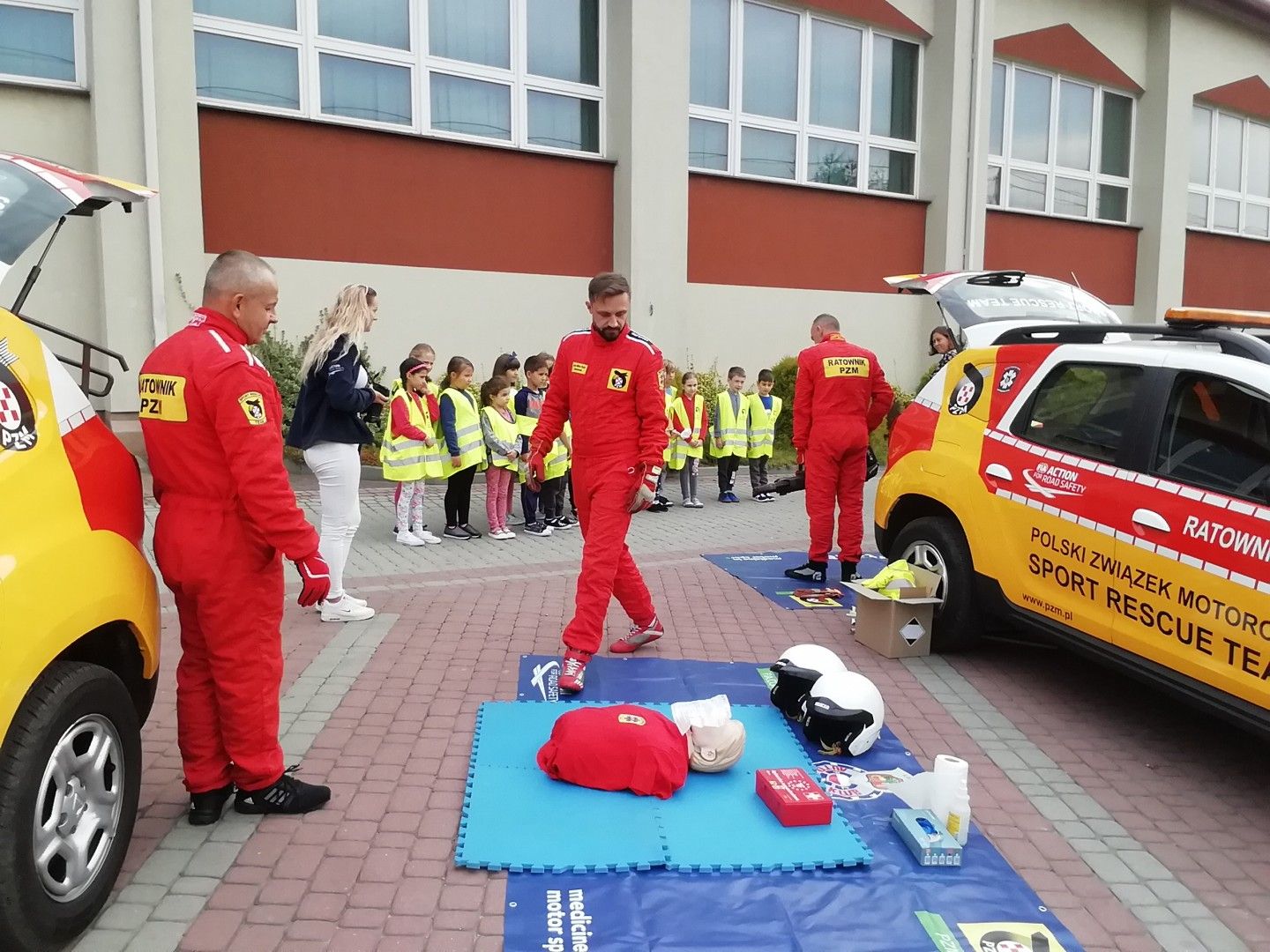 W czwartek 16 września w naszej szkole gościliśmy przedstawicieli z Komendy Powiatowej Policji w Limanowej oraz ratowników Auto Moto Klub – Limanowa. Spotkanie odbyło się w ramach akcji „Bezpieczna droga do szkoły” i rozpoczęło się od pogadanki. Funkcjonariusze policji rozmawiali z dziećmi o bezpieczeństwie oraz zasadach obowiązujących na drodze, zwracając przy tym uwagę, że o zachowaniu bezpieczeństwa muszą pamiętać nie tylko kierujący pojazdami, ale również ci, którzy w jakikolwiek sposób są uczestnikami ruchu drogowego: „Bezpieczeństwo na drodze zależy od nas wszystkich”. Policjanci przypomnieli również najmłodszym o konieczności i korzyściach płynących z noszenia elementów odblaskowych „Odblaski, to życie”… Ponadto, dzięki uprzejmości Auto Moto Klubu miała miejsce prezentacja sprzętu do ratowania życia, wykorzystywanego podczas wypadków drogowych. Odbył się również pokaz oraz praktyczna nauka zasad udzielania pierwszej pomocy.