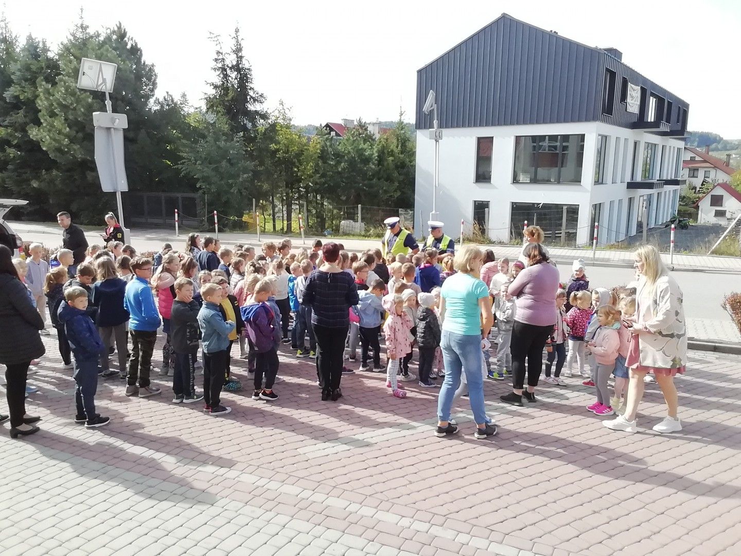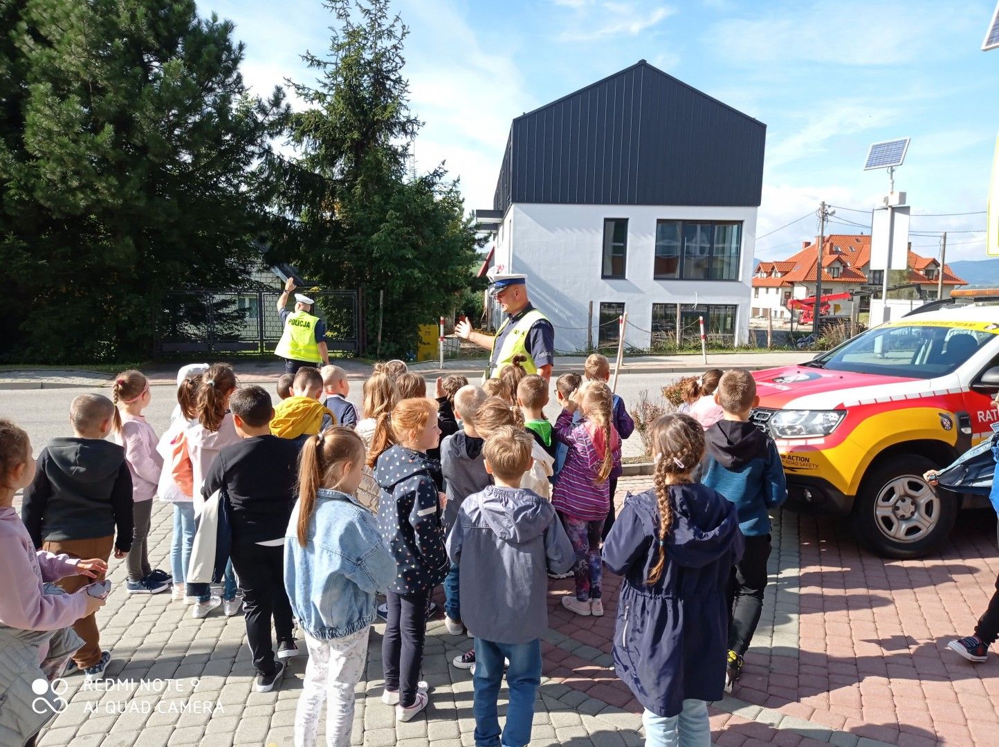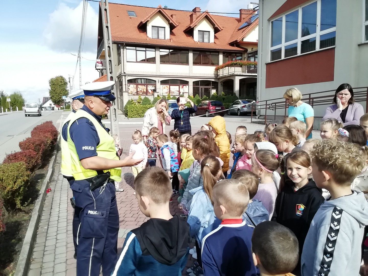 Spotkanie rozpoczęło się od pogadanki. Policjanci rozmawiali z dziećmi o bezpieczeństwie oraz zasadach obowiązujących na drodze, zwracając uwagę, że o zachowaniu bezpieczeństwa muszą pamiętać wszyscy! Nie tylko kierowcy, ale również Ci, którzy w jakikolwiek sposób są uczestnikami ruchu drogowego. Odbyła się także praktyczna nauka przechodzenia przez jezdnię, a to oczywiście pod bacznym okiem policjantów. Ponadto dzięki uprzejmości Auto Moto Klubu miała miejsce m.in. prezentacja sprzętu do ratowania życia, wykorzystywanego podczas wypadków drogowych.