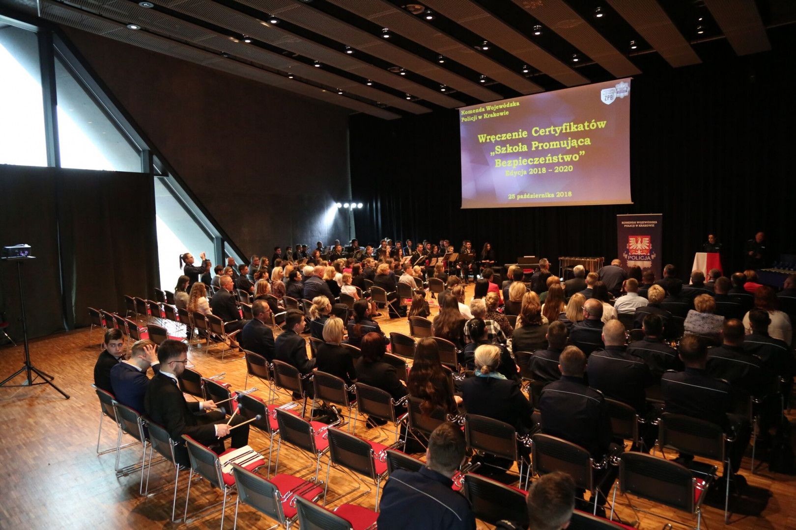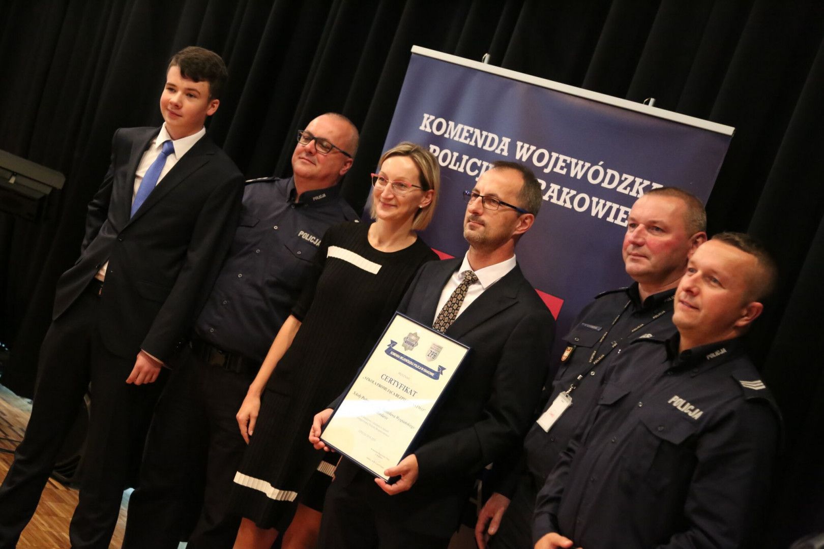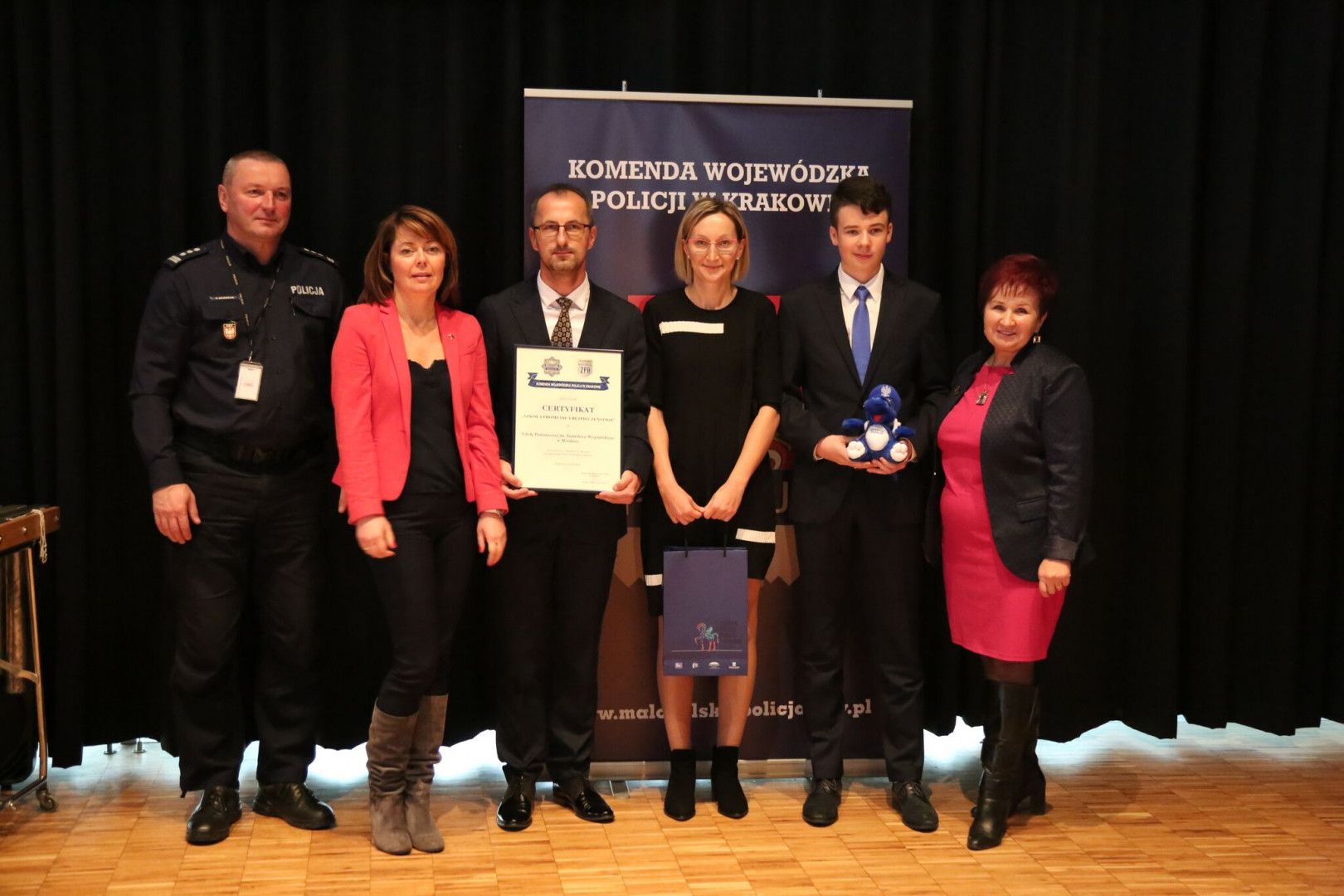 Realizacja zaplanowanych działań pozwoliła na uzyskanie honorowego Certyfikatu „Szkoła Promująca Bezpieczeństwo”. Uroczysta gala z udziałem I Zastępcy Komendanta Wojewódzkiego Policji w Krakowie insp. Pawła Dzierżaka odbyła się 25 października br. w Muzeum Lotnictwa Polskiego w Krakowie. Powyższe przedsięwzięcie wpisało się w obchody 100-ej rocznicy odzyskania przez Polskę niepodległości. W uroczystości uczestniczyli również Pani Halina Cimer – Małopolski Wicekurator Oświaty, przedstawiciele szkół oraz Policji województwa małopolskiego.