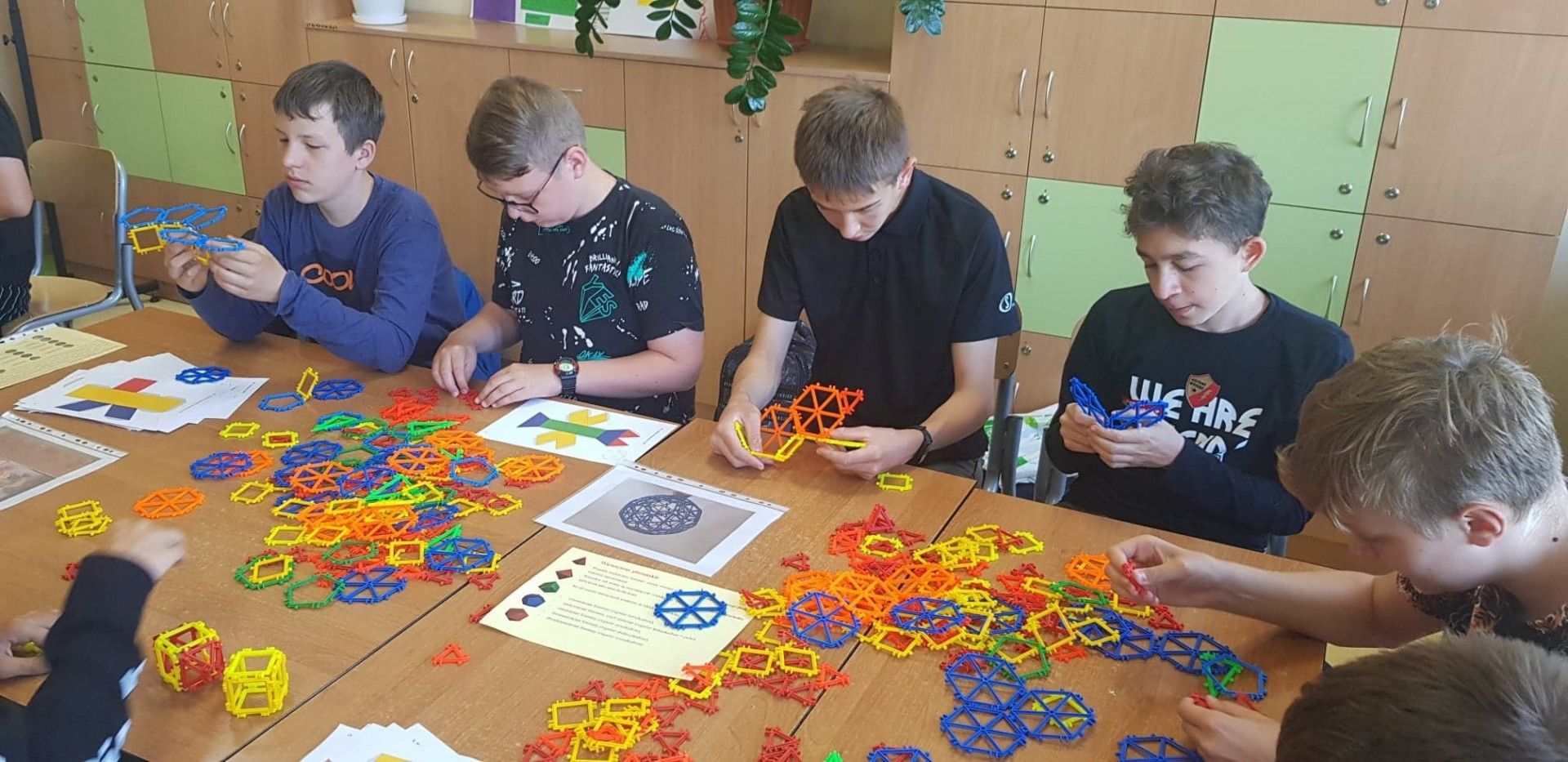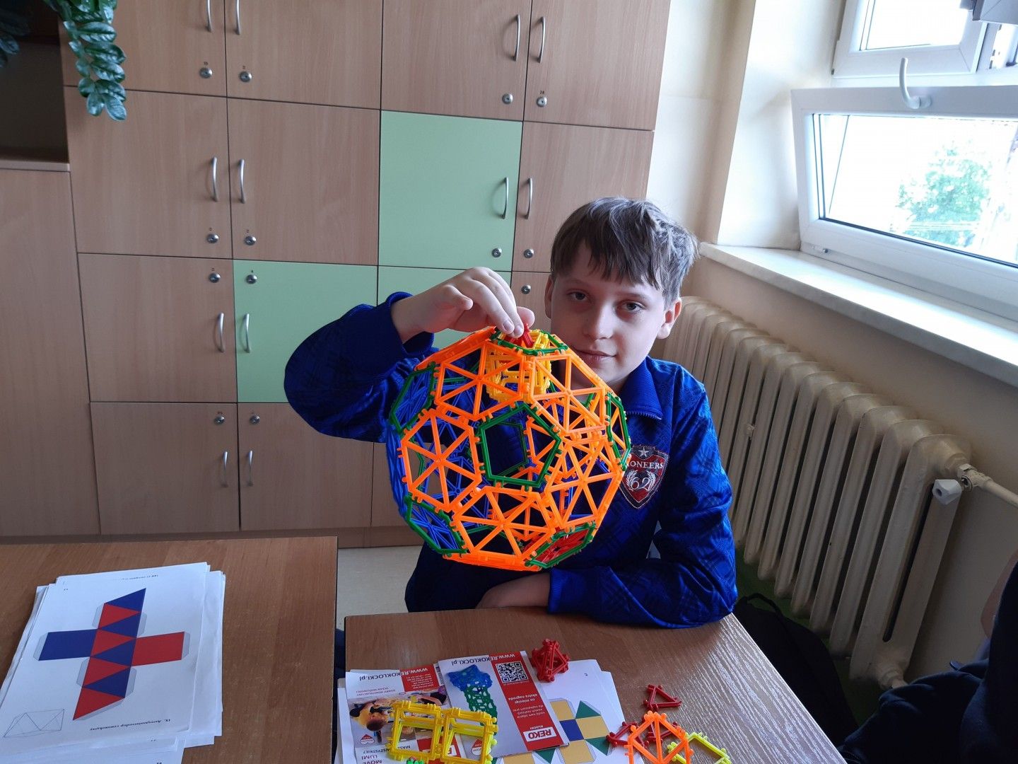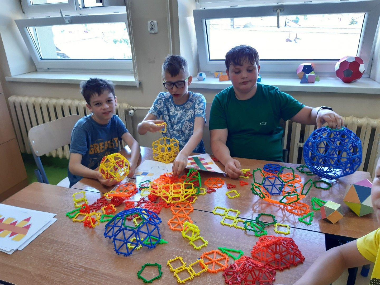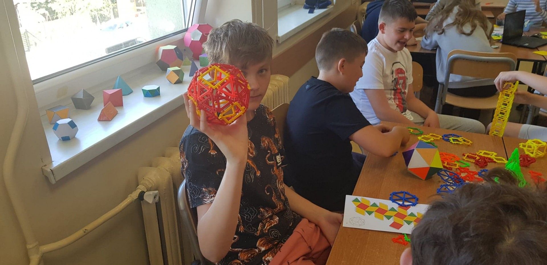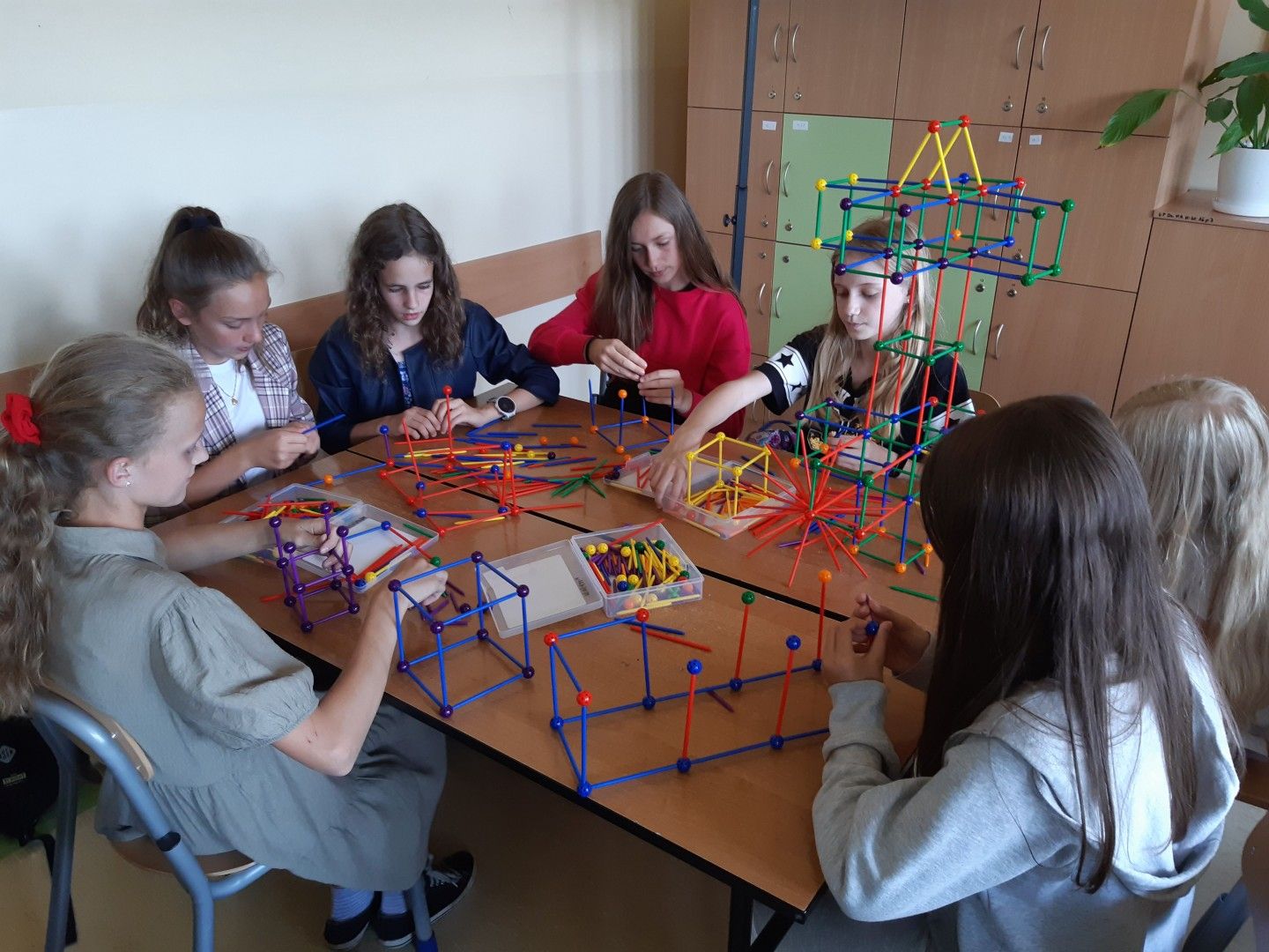 Na stoiskach matematycznych tworzyli graniastosłupy, ostrosłupy, wielościany platońskie, wielościany archimedesowe i inne ciekawe bryły. Podczas warsztatów uczniowie mogli również wykonać bryłkę albo zwierzątko metodą origami. Swoją wiedzę i wyobraźnię geometryczną sprawdzali poprzez rozwiązywanie quizów lub układając łamigłówki przestrzenne Happy Cubes. Natomiast doświadczenia z fizyki dla swoich młodszych kolegów przygotowali i zaprezentowali uczniowie klasy VIIIa. Julka, Paulina, Amelka, Ania, Szymon i Maks przyciągnęli uwagę i zaciekawili pierwszoklasistów.
