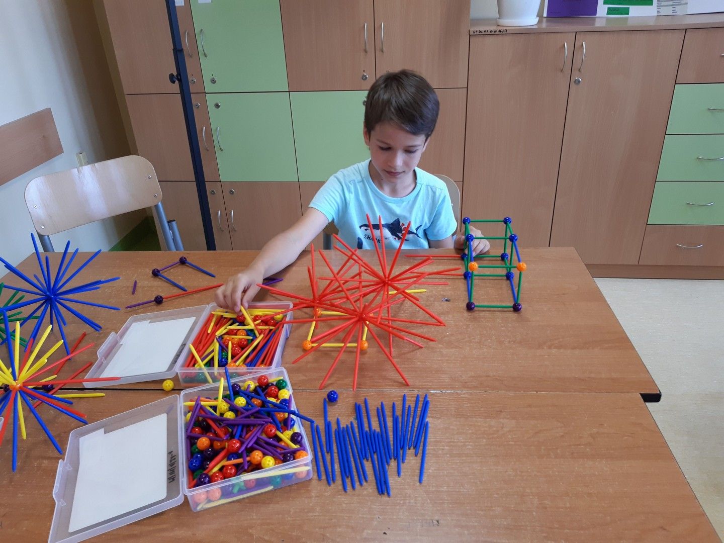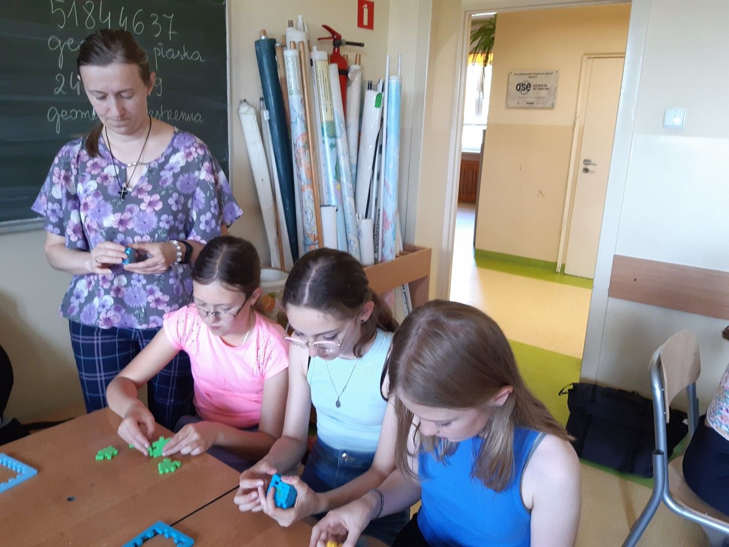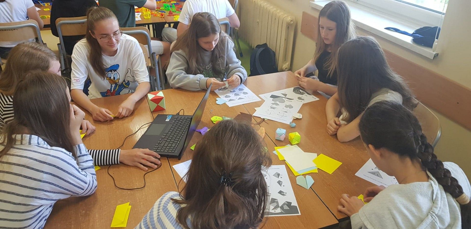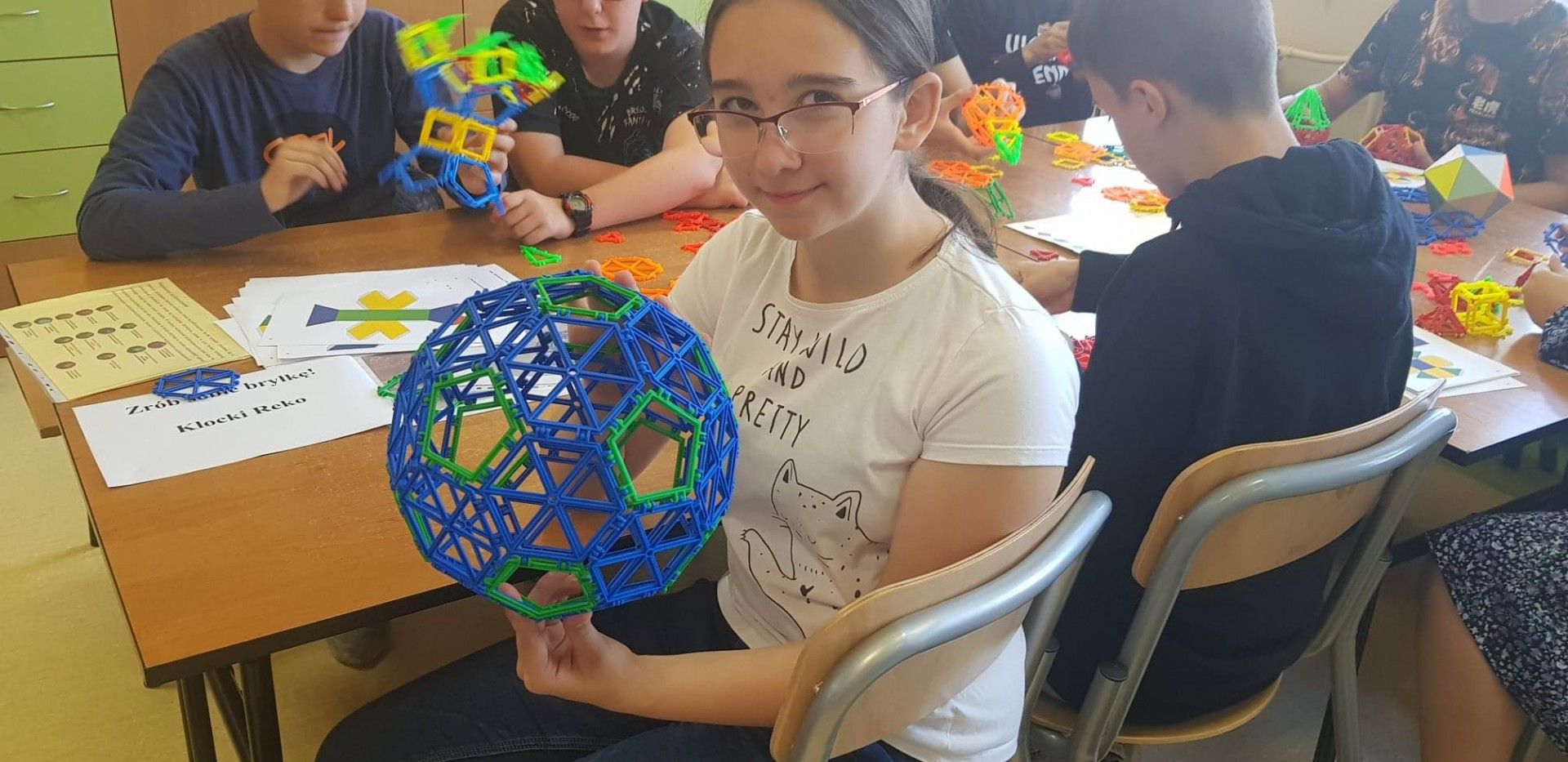 Na stoiskach matematycznych tworzyli graniastosłupy, ostrosłupy, wielościany platońskie, wielościany archimedesowe i inne ciekawe bryły. Podczas warsztatów uczniowie mogli również wykonać bryłkę albo zwierzątko metodą origami. Swoją wiedzę i wyobraźnię geometryczną sprawdzali poprzez rozwiązywanie quizów lub układając łamigłówki przestrzenne Happy Cubes. Natomiast doświadczenia z fizyki dla swoich młodszych kolegów przygotowali i zaprezentowali uczniowie klasy VIIIa. Julka, Paulina, Amelka, Ania, Szymon i Maks przyciągnęli uwagę i zaciekawili pierwszoklasistów.