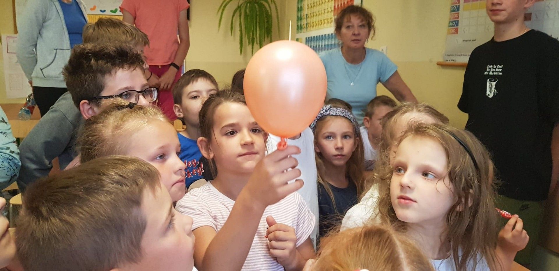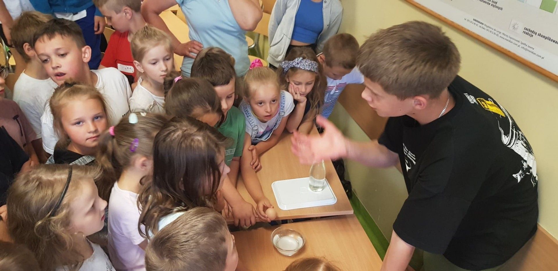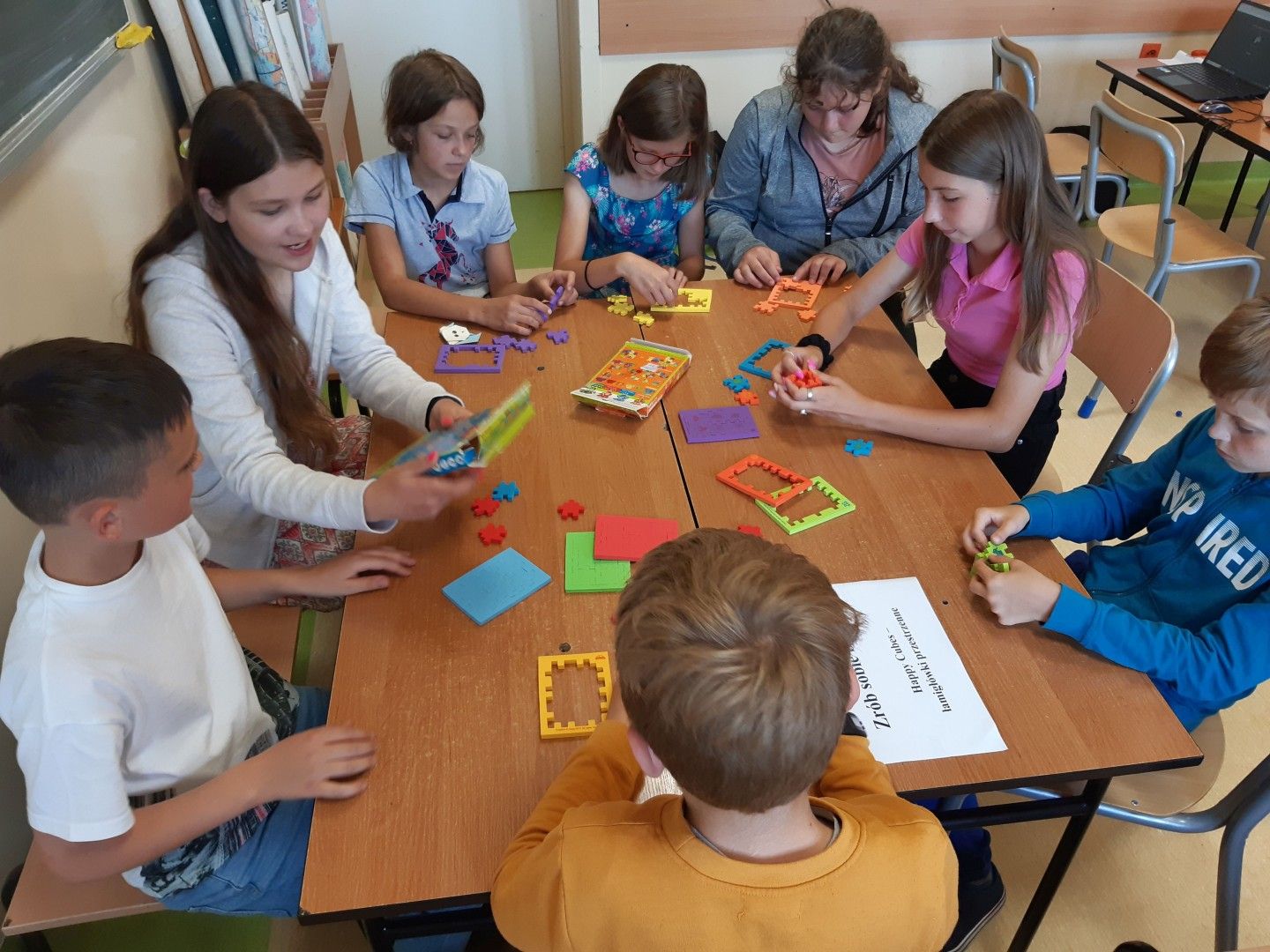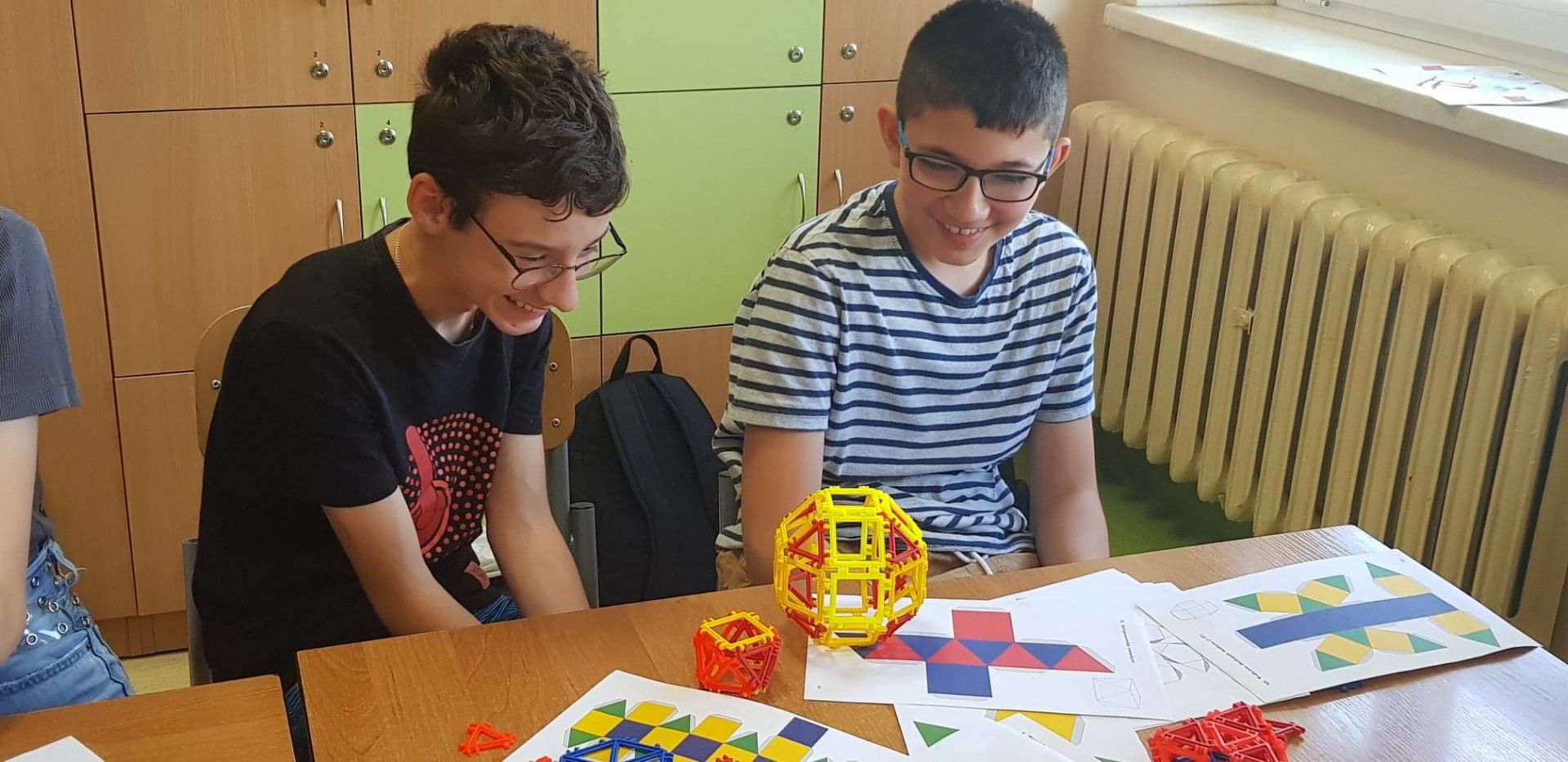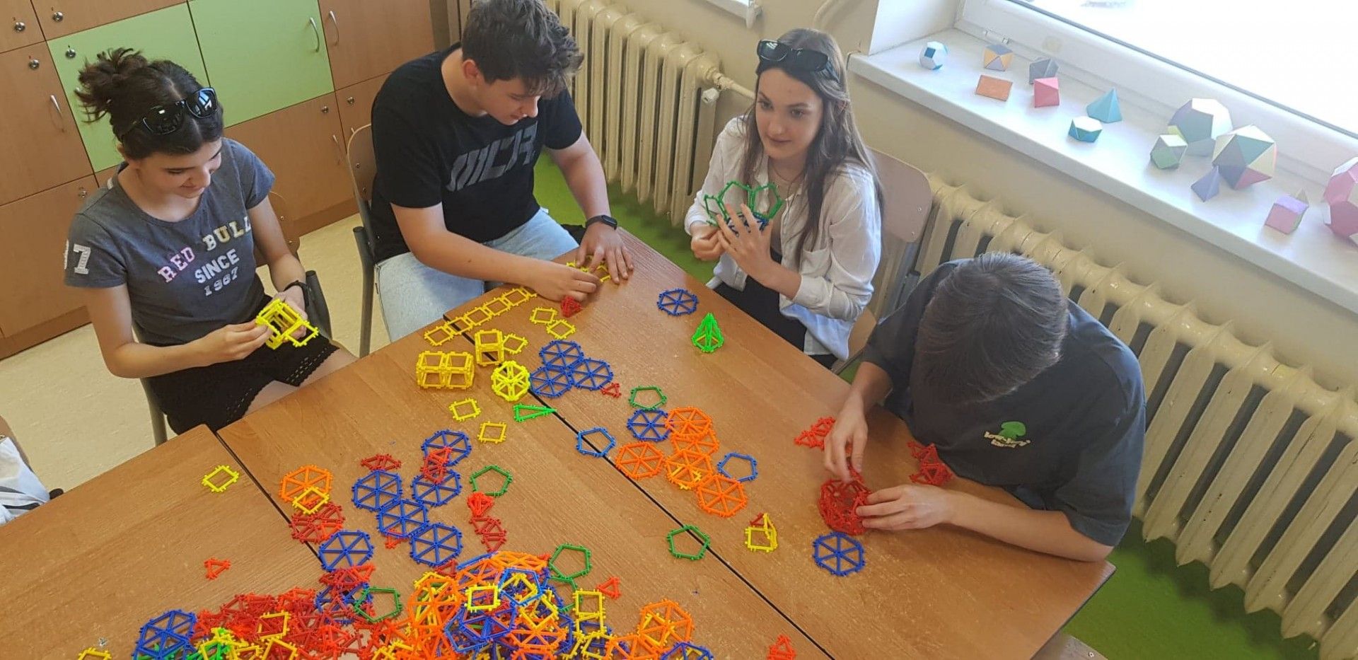 Na stoiskach matematycznych tworzyli graniastosłupy, ostrosłupy, wielościany platońskie, wielościany archimedesowe i inne ciekawe bryły. Podczas warsztatów uczniowie mogli również wykonać bryłkę albo zwierzątko metodą origami. Swoją wiedzę i wyobraźnię geometryczną sprawdzali poprzez rozwiązywanie quizów lub układając łamigłówki przestrzenne Happy Cubes. Natomiast doświadczenia z fizyki dla swoich młodszych kolegów przygotowali i zaprezentowali uczniowie klasy VIIIa. Julka, Paulina, Amelka, Ania, Szymon i Maks przyciągnęli uwagę i zaciekawili pierwszoklasistów.