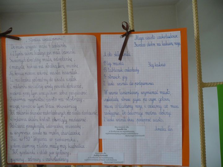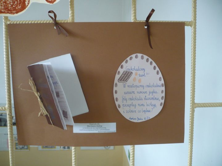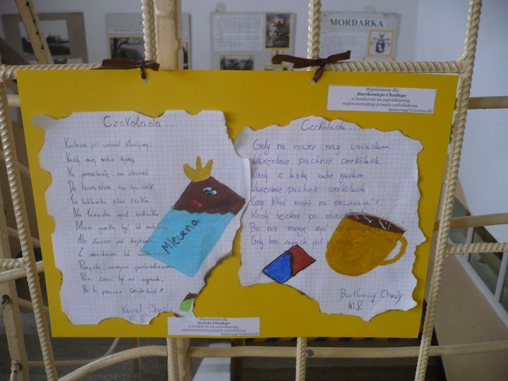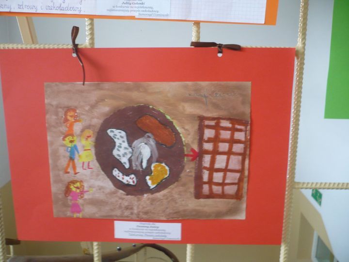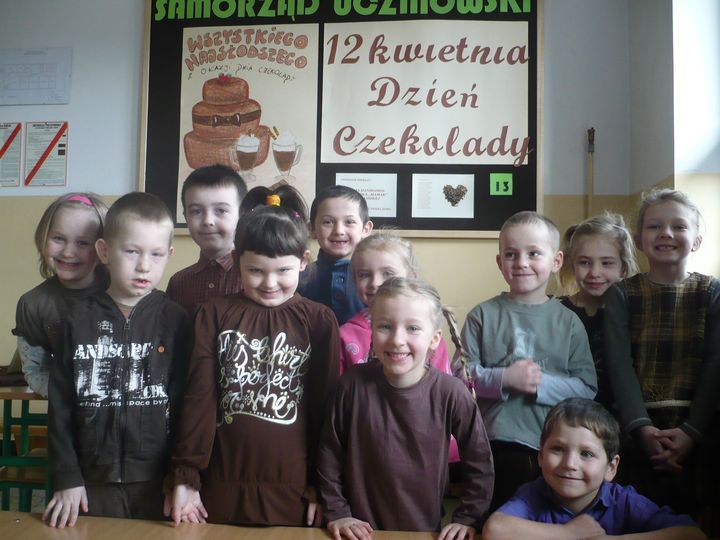 Piątek w naszej szkole był bardzo słodkim dniem. Samorząd Uczniowski zorganizował "DZIEŃ CZEKOLADY". W tym dniu wszyscy uczniowie poznali tajniki produkcji i pochodzenie tego słodkiego przysmaku. Dowiedzieli się, jak długą drogę muszą przebyć ziarna kakaowca, by w ostatecznej formie trafić do sklepów i stać się czekoladą - przysmakiem całego świata. Uczniowie poznali także wartości odżywcze czekolady, degustowali różne rodzaje czekolady, wykonali prezentację min. zgromadzili czekoladowe przepisy, książki o czekoladzie, ilustracje ... Były również czekoladowe quizy i zabawy. W konkursie na „ Najciekawszy lub najśmieszniejszy przepis czekoladowy” nagrody otrzymali: Natalia Cabała, kl. 0 a, Zuzanna Jasica kl. 0 b, Kamil Piórkowski kl. 0 b, Julita Golonka kl. II b, Mariusz Jasica kl. II b, Patrycja Nawalaniec kl. II b. Wyróżnienia trafiły do: Dominiki Czajki kl. 0 c, Sary Słowiak kl. I, Amelii Lis kl. II b, Karola Chudego kl. III oraz Bartłomieja Chudego kl. V.