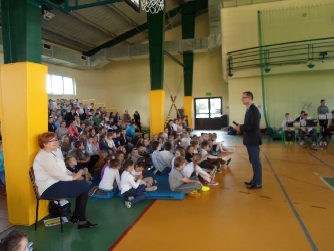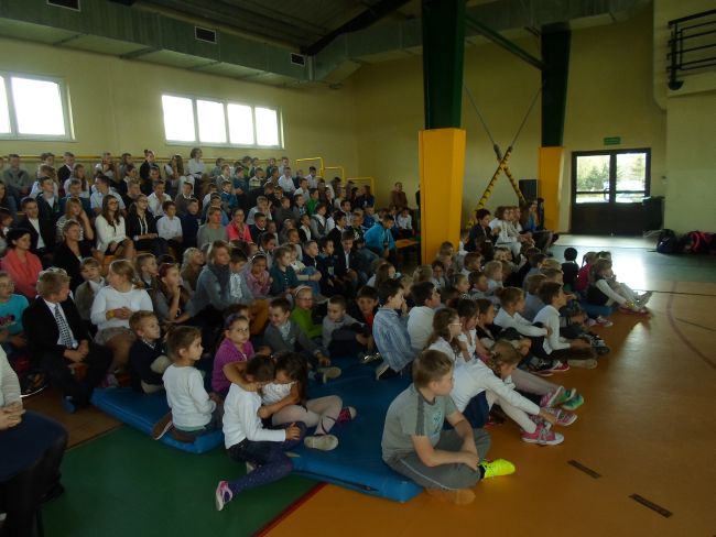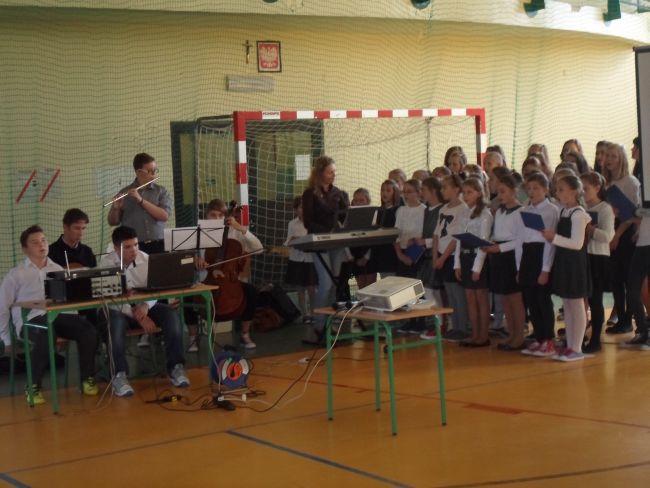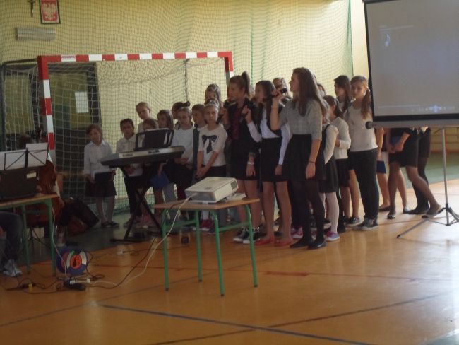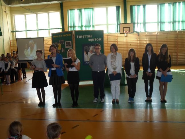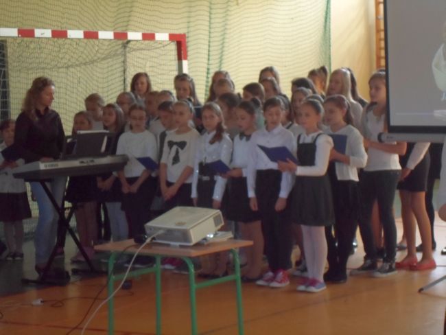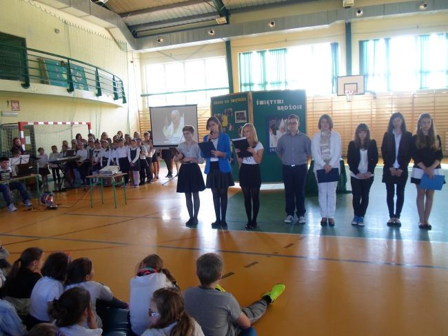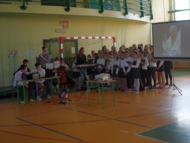 Wszyscy  ubraliśmy się odświętnie. Uczniowie wraz z gronem pedagogicznym oglądnęli film, o Świętym Papieżu. Później uczniowie z klasy trzeciej gimnazjum: Zuzanna Łyszczarz, Agnieszka Lis, Aleksandra Gawron, Agnieszka Szubryt, Karolina Pławecka, Katarzyna Olesiak i Patryk Lupa oraz Katarzyna Raczek z klasy pierwszej,  odczytali kilka ważnych informacji i wierszy o Karolu Wojtyle. Uroczystość uświetnił piękny występ szkolnego chóru i zespołu muzycznego. Występ oraz film bardzo wzruszył całą szkołę.