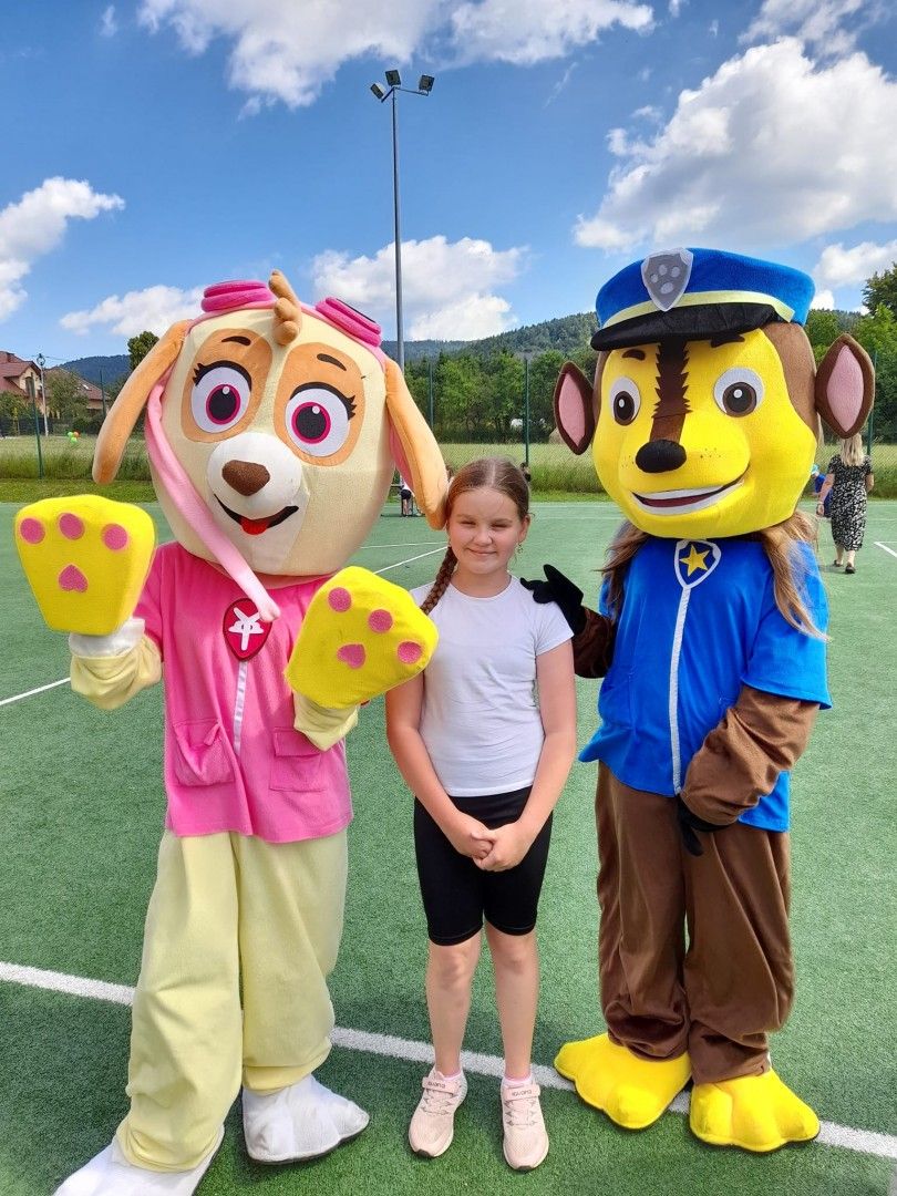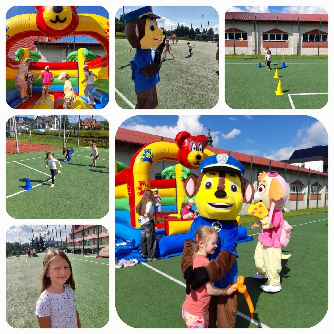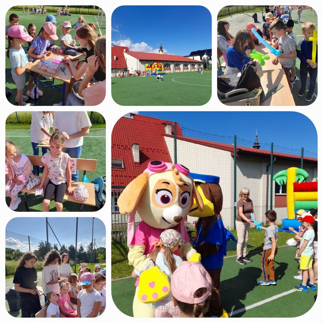 Były tańce, zabawy z Cheesem i Sky - bohaterami bajki „Psi Patrol”, lody, słodkości, pyszny poczęstunek, zamek dmuchany, kolorowe balony oraz tatuaże. Tor przeszkód, przeciąganie liny oraz wiele innych sportowych konkurencji. W organizacji bardzo pomogli nam uczniowie klas 7 i 8, których zaangażowanie w dzisiejszy dzień było nieocenione, bardzo Wam za to dziękujemy! Ogromne podziękowania składamy również naszym wspaniałym Darczyńcom: