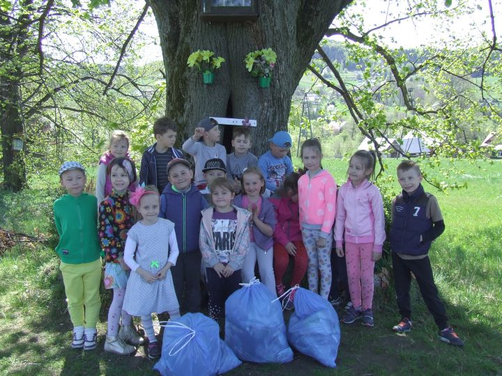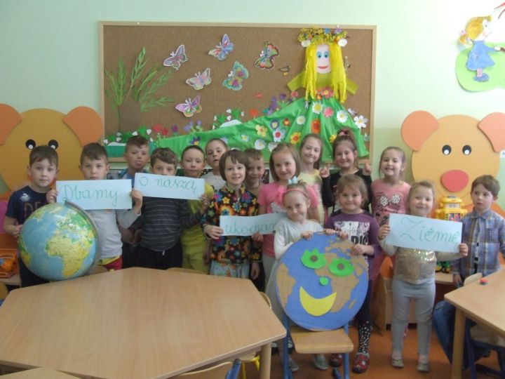 Dni 18 -20 kwietnia upłynęły w naszym przedszkolu pod hasłem ekologia. A wszystko z okazji obchodów Światowego Dnia Ziemi ( 22 kwietnia). Jest to największe ekologiczne święto. Podczas zajęć i zabaw dzieci dowiedziały się jak dbać o środowisko i otaczającą nas przyrodę. Na spacerach podziwiały piękno naszej Ziemi, dostrzegając także to, co jej szkodzi. Dzieliły się pomysłami na to jak już mogą pomagać przyrodzie, by zostać jej przyjaciółmi. Przyrzekali - ,, Chronić przyrodę, oszczędzać wodę, dokarmiać ptaki, dbać o zwierzaki, kwiaty hodować, drzewa szanować, prądu nie marnować i nigdy nie śmiecić”. Na dowód tego, że chcą działać, pomagając Ziemi, by była czysta, piękna i zielona… zaangażowały się w akcję sprzątania najbliższej okolicy. Widząc, jak dużo jest śmieci wokół i jak trudno to wszystko posprzątać, przedszkolaki nauczyły się, że czystość otoczenia, w którym przebywamy zależy tylko od nas.