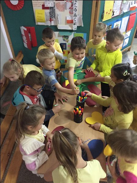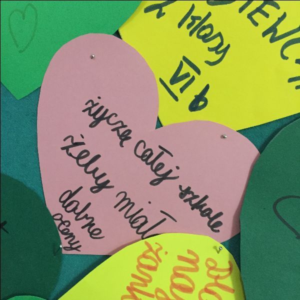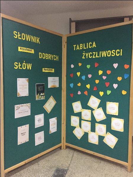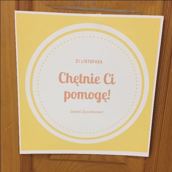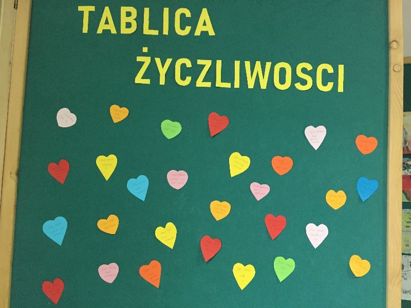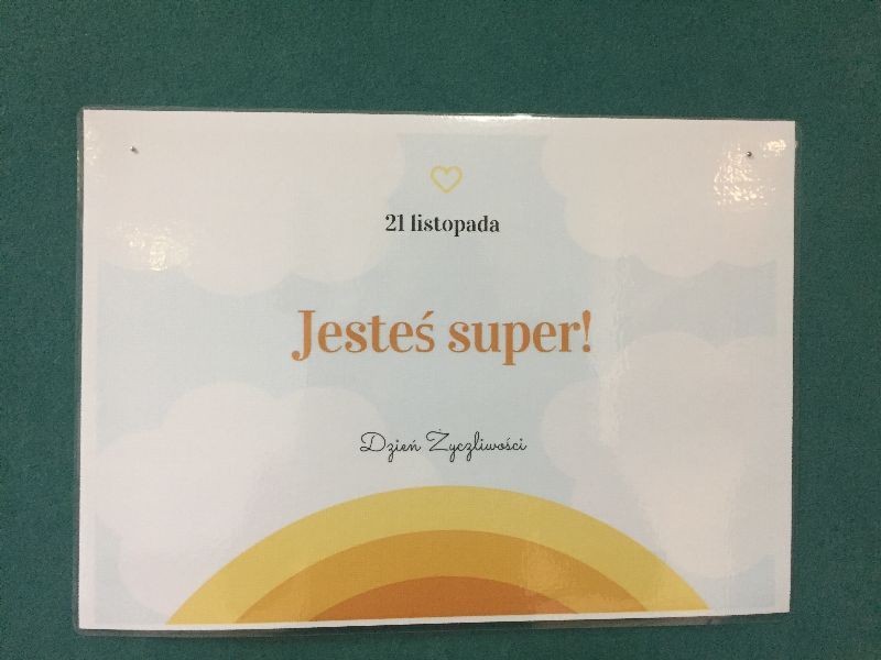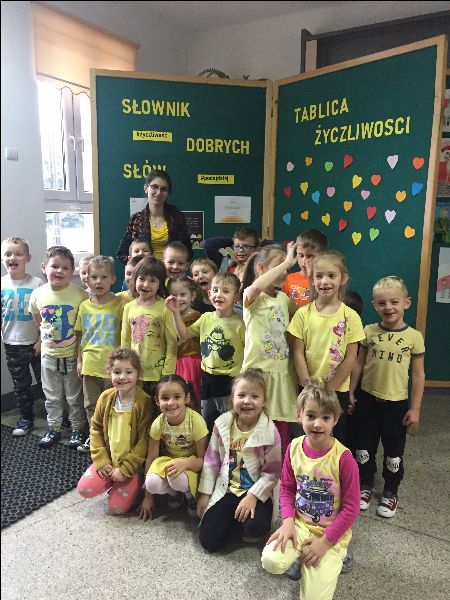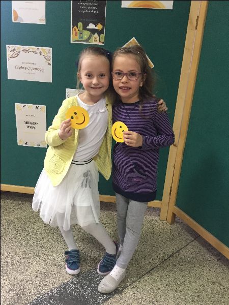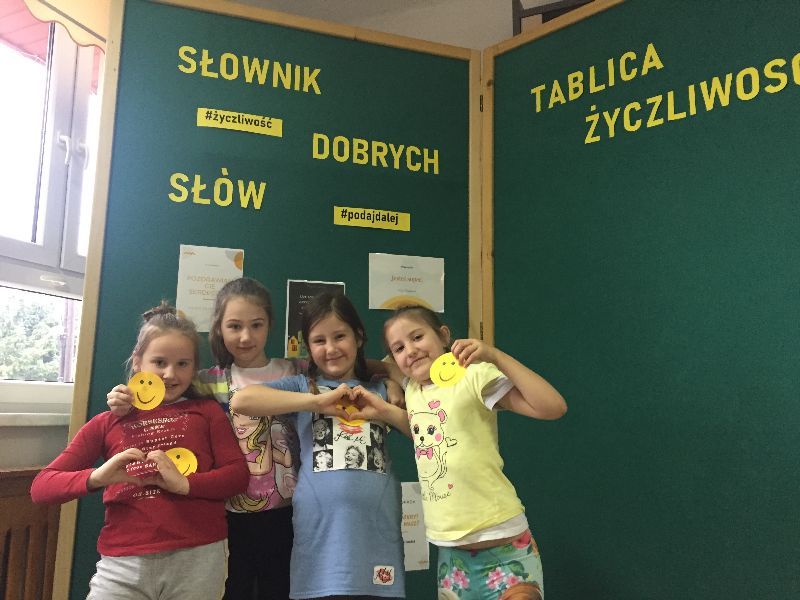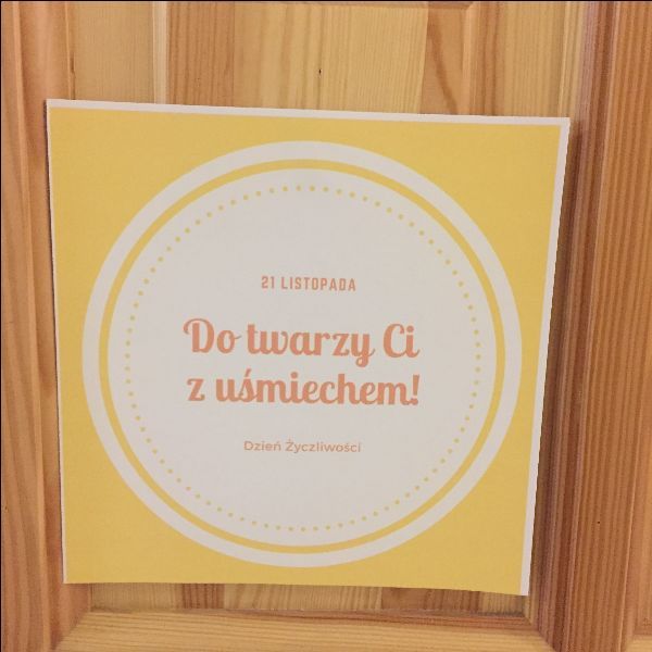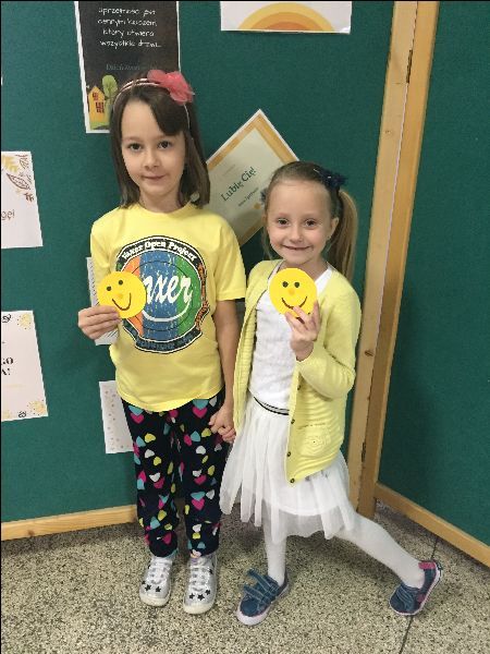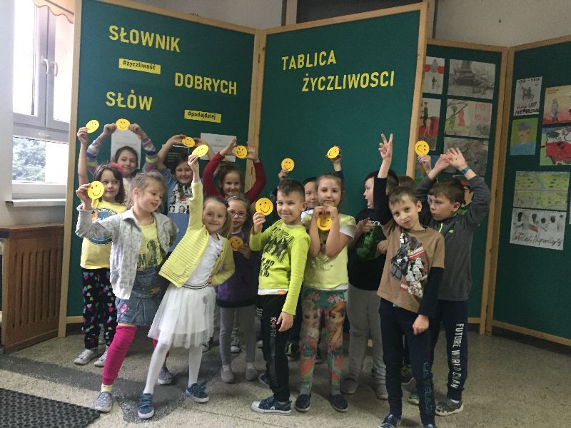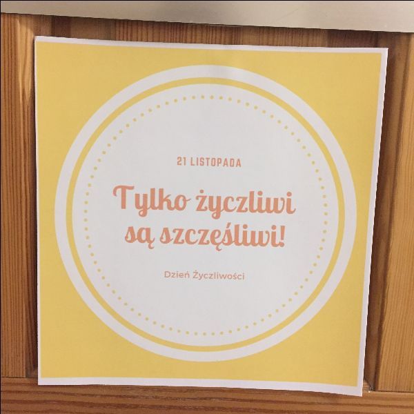 Na parterze pojawił się w tym dniu SŁOWNIK DOBRYCH SŁÓW, a także TABLICA ŻYCZLIWOŚCI I POZDROWIEŃ, na której każdy mógł umieścić dobre, miłe słowa, skierowane do konkretnej osoby lub do grupy, klasy itp. W ramach Dnia Życzliwości na drzwiach sal lekcyjnych pojawiały się tematyczne przysłowia, wierszyki, przypominające o potrzebie codziennego uśmiechania się, obdarowywania innych ciepłymi słowami i przyjaznymi gestami. W tym dniu wszyscy starali się zachować uśmiech na ustach, nie dali się prowokować, byli mili dla innych. Wszelkie kłótnie, żale i złości odstawiliśmy na bok. Ściskaliśmy sobie dłonie, ustępowaliśmy pierwszeństwa innym. W naszej szkole dominował kolor żółty – kolor optymizmu i radości. Dla odróżnienia i podkreślenia ważności tego dnia uczniowie i nauczyciele byli ubrani na żółto bądź też mieli żółte akcenty ubioru.