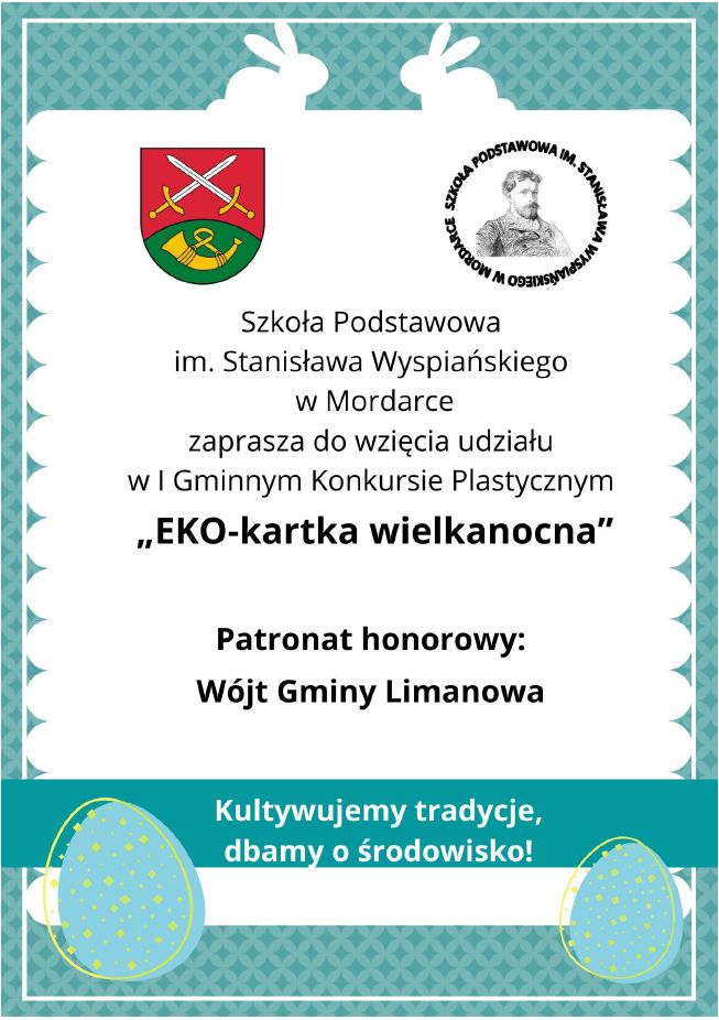 Nasza szkoła zaprasza do wzięcia udziału w I Gminnym Konkursie Plastycznym „EKO-kartka wielkanocna”. Konkurs został objęty honorowym patronatem przez Wójta Gminy Limanowa. Poniżej znajduje się regulamin konkursu wraz z niezbędnymi załącznikami.