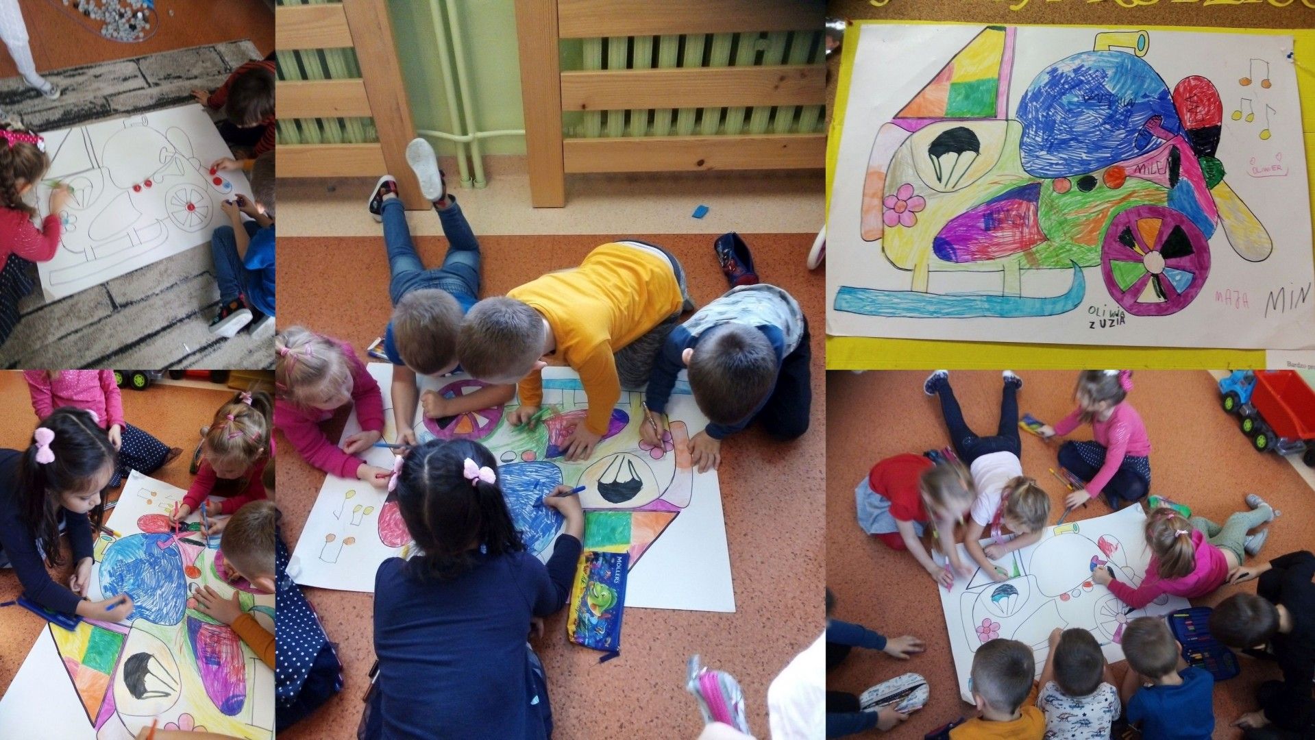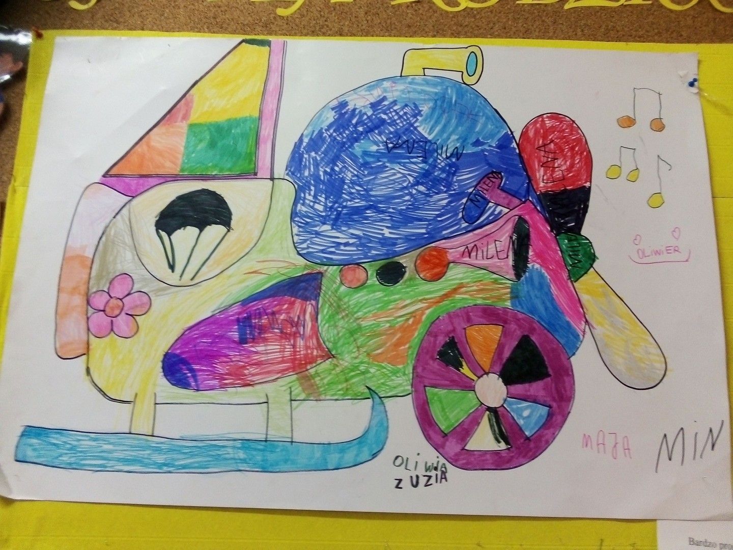 Dzieci z klasy 0 b wykonały zadanie specjalne. Stworzyły dla naszego bohatera "automobil". Dobrze wiemy, że Koziołek Matołek bardzo lubi podróżować i robi to na wiele sposobów. Specjalnie dla niego zaprojektowaliśmy wspólnie pojazd, który porusza się po lądzie, wodzie, pod wodą i w powietrzu. Dodatkowo wyposażony jest w spadochron oraz magiczne guziki. Dzieci zgodnie wypełniły jego kontury kolorowymi nakrętkami. Zanim to jednak wykonały musiały posegregować je na odpowiednie kolory. Po wykonanej pracy chętnie zabrały się za sprzątanie i kolorowanie powstałego rysunku. Zabawy zakrętkami sprawiły nam dużo radości, polecamy każdemu.