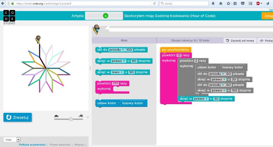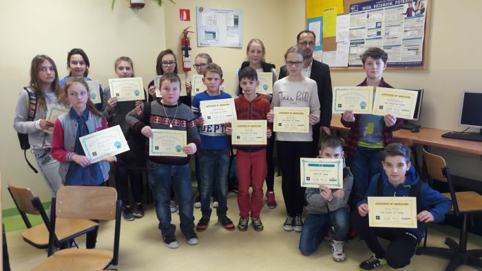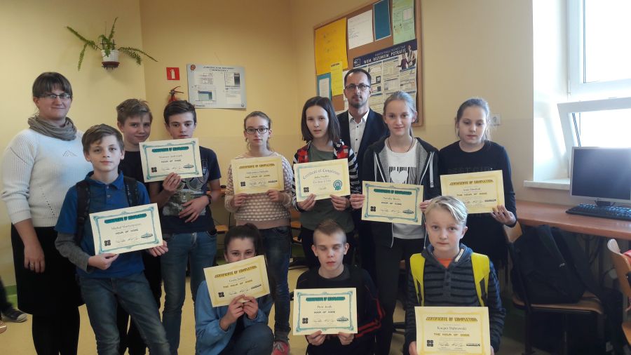 Wprowadzenie innowacji w szkole zachęciło uczniów do rozwijania swoich umiejętności informatycznych. Uczniowie klasy VI wzięli udział w Godzinie Kodowania - największej inicjatywie edukacyjnej w historii, adresowanej do uczniów z całego świata zachęcającej do nauki informatyki. Na stronie Code.org układali z bloków pierwsze programy i zdobyli certyfikaty potwierdzające umiejętności kodowania.