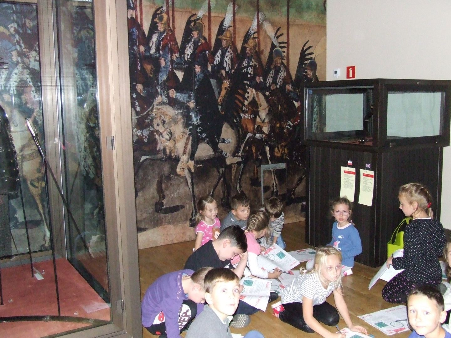 Wszyscy z zainteresowaniem i skupieniem słuchali opowieści, podziwiając wspaniałe eksponaty: dawną broń, zbroje, mundury i inne ciekawe pamiątki. W trakcie tej jakże interesującej lekcji dzieci wykazały się znajomością wydarzeń historycznych, odpowiadając na pytania przewodnika i zadając je. Każde dziecko otrzymało kilka kart z zadaniami. Wykonały m.in. rysunki w formie projektów swoich królewskich pieczęci, a nawet samodzielnie odczytywały i zapisywały niektóre treści. Druga grupa poznawała twórczość wielkiego polskiego artysty Stanisława Wyspiańskiego, patrona naszej szkoły na wystawie pod hasłem "Łąka w kościele". Zachwycając się pracami malarza dzieci poznawały także ich historię, techniki wykonania. Samodzielnie wykonały zadanie plastyczne, które polegało na stworzeniu wzoru kolorowego witraża. Prace wyszły przepięknie.