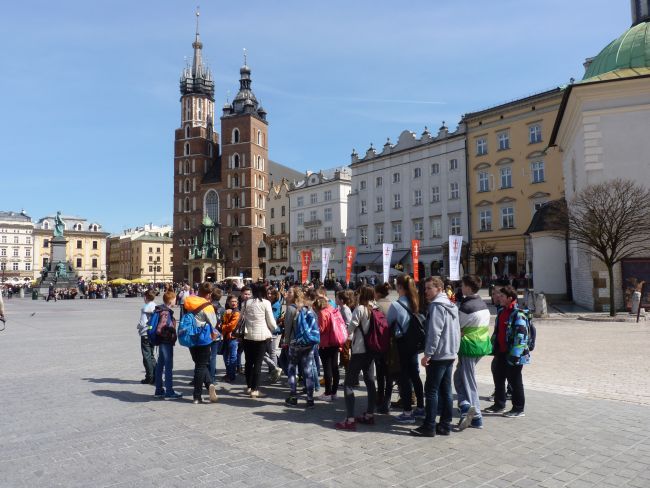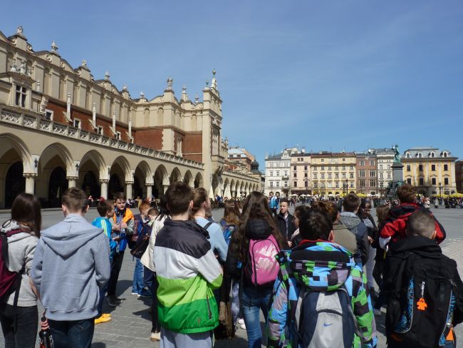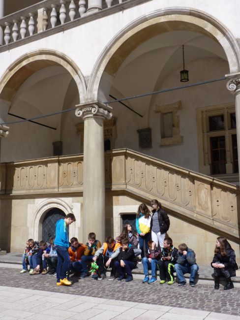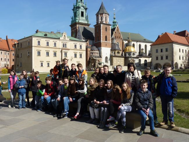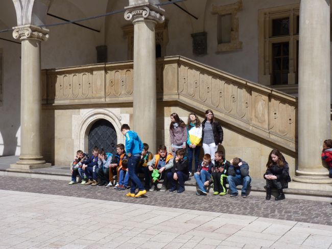 Na Wawel szliśmy brzegiem Wisły. Gdy weszliśmy na dziedziniec, zostaliśmy pod opieką pani Biernat, ponieważ Pani wychowawczyni udała się po odbiór biletów. W międzyczasie mogliśmy rozciągnąć nogi, wbiegając na ,,dom teletubisiów”, czyli usypany pagórek ziemi, porośnięty trawą. Musieliśmy odłożyć plecaki do szatni. Uczestnicy wycieczki zostali podzieleni na dwie grupy. Na Wawelu zwiedziliśmy między innymi grób Kaczyńskich i Józefa Piłsudzkiego, komnaty, a w nich oglądaliśmy cudowne arrasy, dywany, głowy wawelskie i portrety. Pani przewodnik opowiedziała nam ciekawe legendy. Jedną z nich była opowieść o głowie z zasłoniętymi ustami. Po wyjściu z Wawelu byliśmy zmęczeni, lecz musieliśmy jeszcze dojść na dworzec. Panie ponownie nas przeliczyły. W drodze powrotnej wstąpiliśmy do McDonalds ’a. Tam kupiliśmy sobie coś do jedzenia. Pół godziny później weszliśmy do autobusu i ruszyliśmy w stronę szkoły.