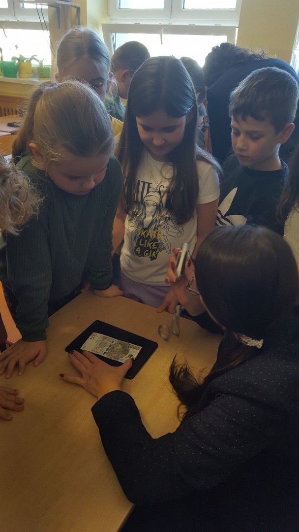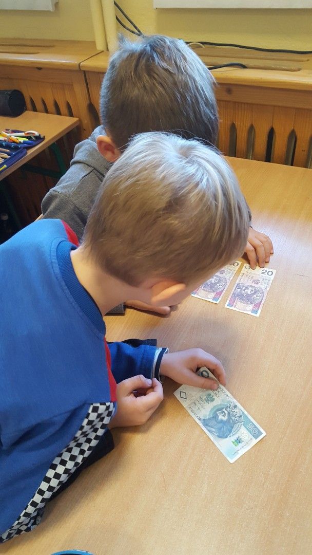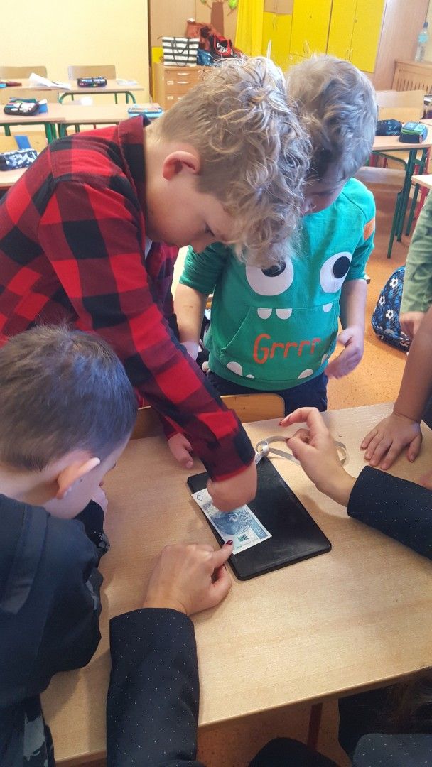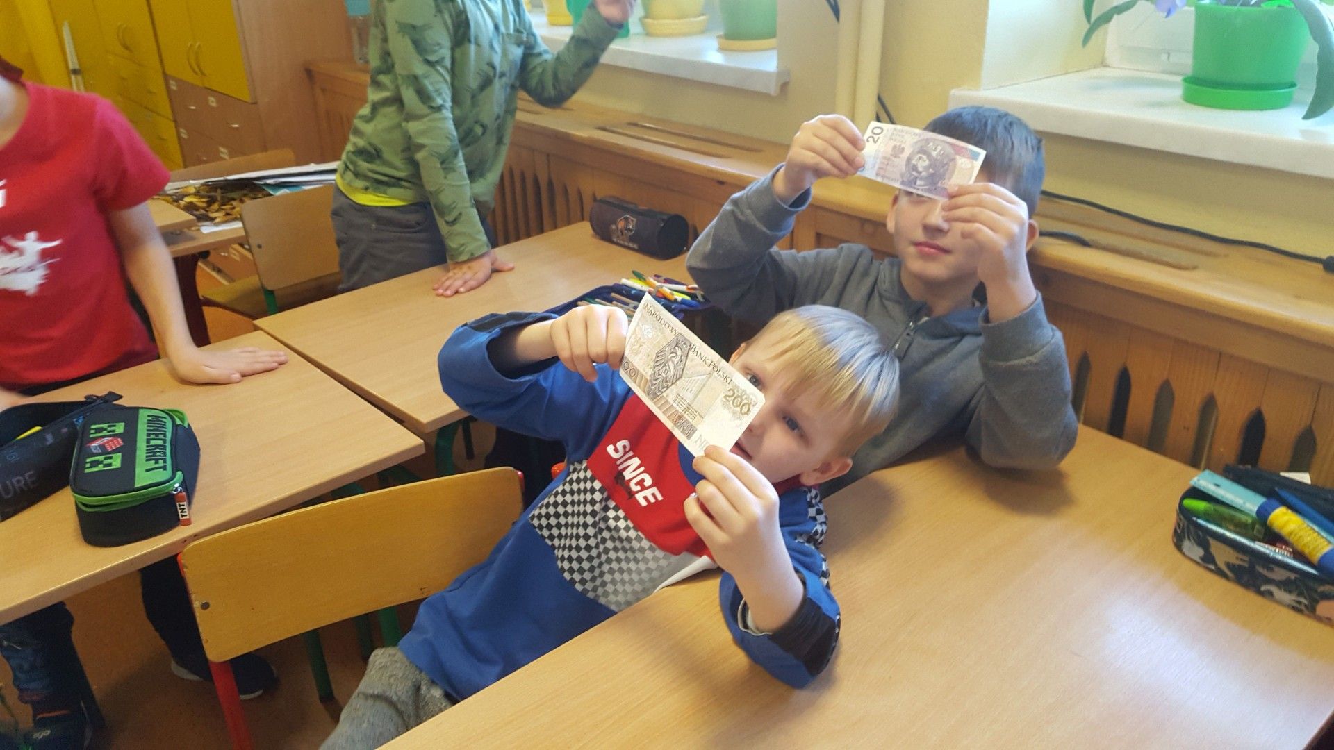 W tym roku szkolnym panie z banku, pani Kasia Stefanowicz i pani Małgosia Poręba, odwiedziły uczniów klasy IIb. Dzieci dowiedziały się dlaczego pieniądze są nam potrzebne i jakie są współczesne rodzaje pieniądza. Każdy uczeń mógł sprawdzić autentyczność banknotów za pomocą specjalnego urządzenia. Dzieci podczas rozmowy z prowadzącymi zajęcia wykazały się dużą wiedzą na temat polskich monet i banknotów. Za prawidłowe odpowiedzi uzyskały upominki.