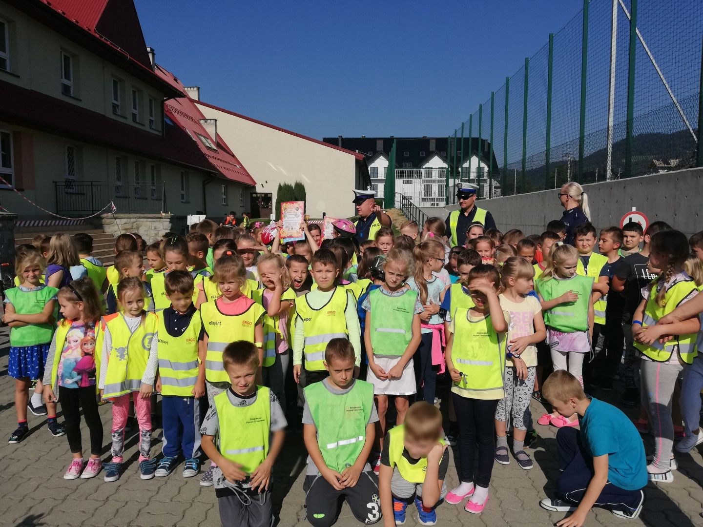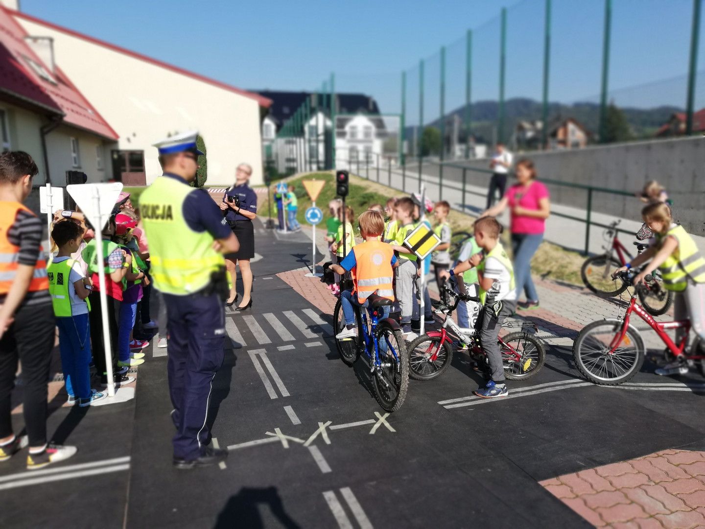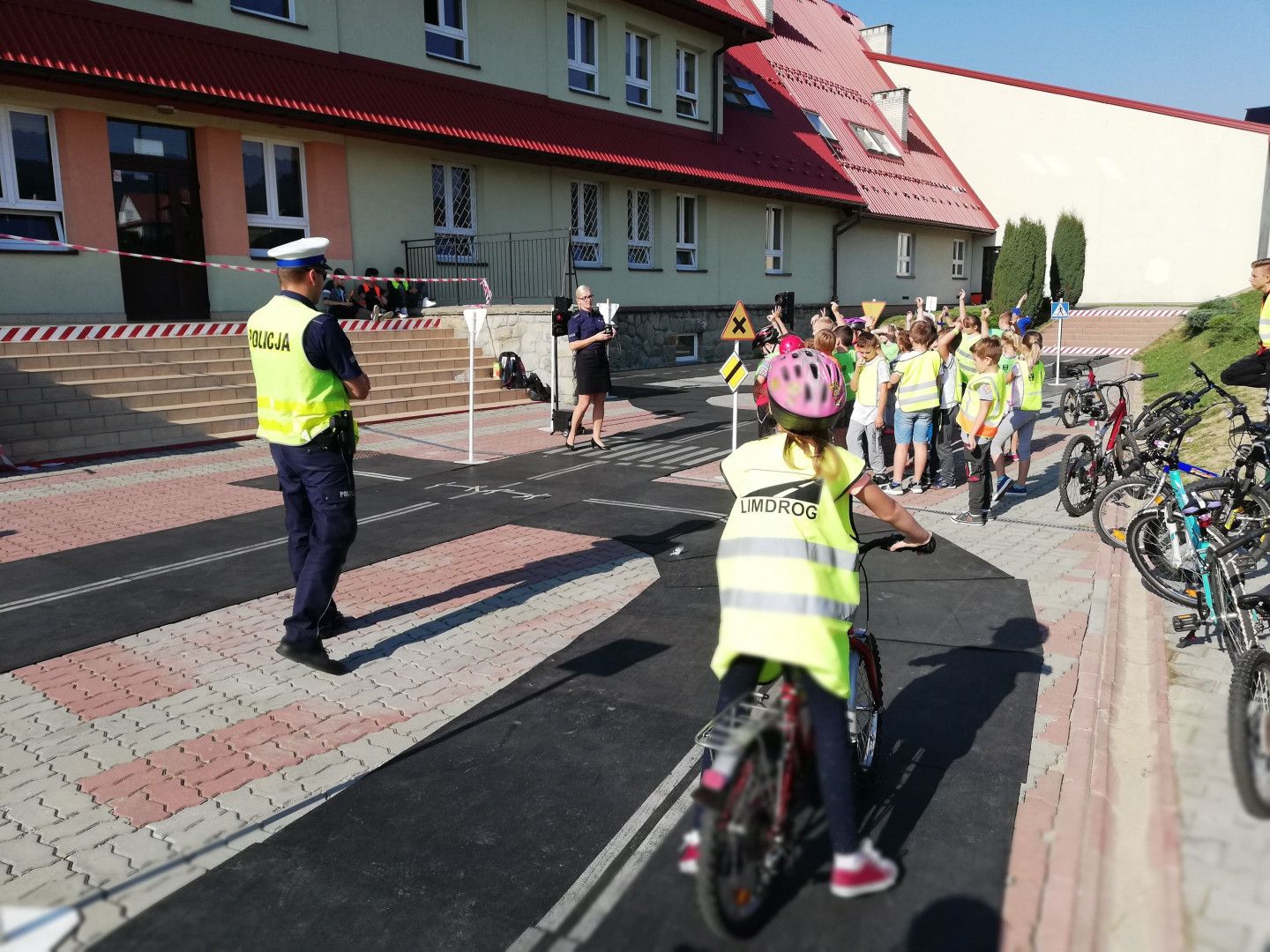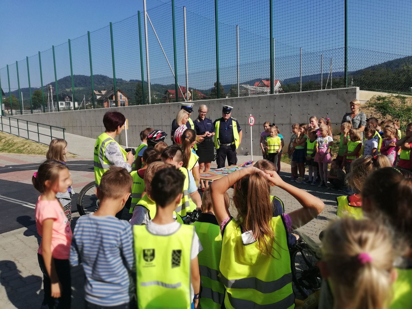Mając na uwadze bezpieczeństwo uczniów na imprezę zaprosiliśmy policjantów z limanowskiej drogówki, którzy z wielkim zaangażowaniem podeszli do ważności tematu. Policjanci na początku omówili zasady ruchu drogowego, wykorzystując w tym celu mobilne miasteczko, które obrazowało omawiane sytuacje drogowe. Spacerując po „uliczkach miasteczka” utrwalali z dziećmi znaczenie znaków drogowych, zasady reagowania na światła sygnalizatorów, sposoby zachowania się w ruchu drogowym na skrzyżowaniach, przejściach dla pieszych itp. W formie przypomnienia wyjaśnili: dlaczego na drodze należy zachować ostrożność ?, po co są przepisy ruchu drogowego? Ponadto funkcjonariusze omówili obowiązkowe wyposażenie roweru, a także w jaki sposób rowerzysta oraz pieszy powinien poruszać się po drogach. Podkreślili również jak ważnym dla bezpieczeństwa dzieci jest posiadanie kasków, kamizelek odblaskowych i innych elementów odblaskowych. Po części teoretycznej, ćwiczenia praktyczne ruszyły „pełną parą”, a więc rowerowe zmagania, czyli jazda z zastosowaniem poznanych przepisów. Dzieciaki ubrane w kaski i kamizelki odblaskowe wyruszyły na tor, gdzie musiały wykazać się zdobytą wcześniej wiedzą. Z radością i zapałem śmigały na rowerach, aż miło było popatrzeć. Była to dla nich ogromna frajda, ale i również nauka.
