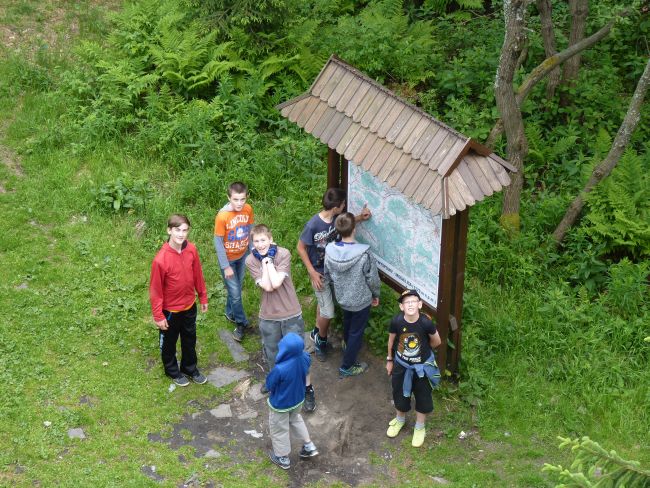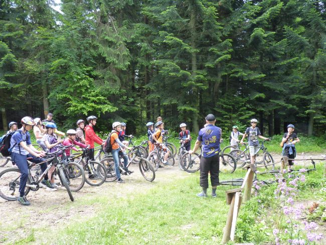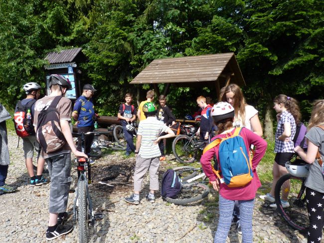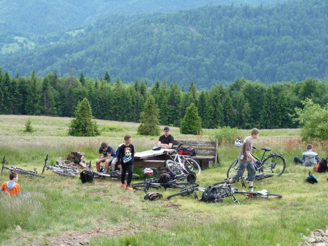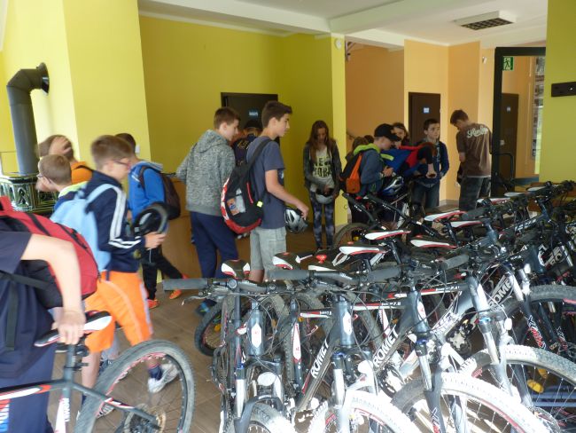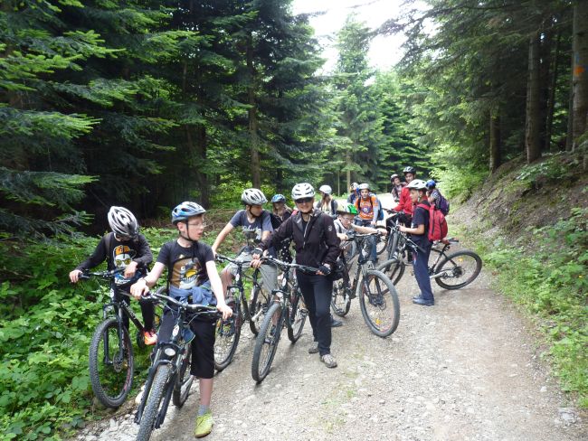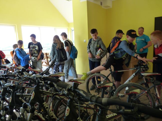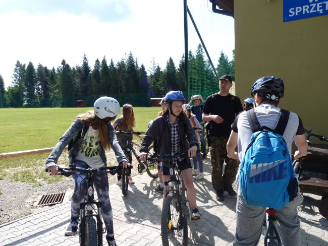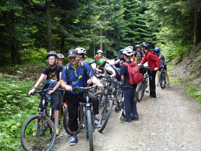 O godzinie 8.00 spod budynku szkoły skierowaliśmy się autobusem firmy Pasyk&Gawron na Zalesie. Nasza grupa składała się z uczestników o różnych możliwościach kondycyjnych, dlatego dobrze zapamiętaliśmy zasady zachowania się w grupie w górach jak również zasady bezpieczeństwa na rowerze. Szczęście sprzyjało nam od początku ponieważ czwartkowy poranek, odmiennie od wcześniejszych dni, przywitał na słońcem, a ks. Tomasz pobłogosławił przed wyzwaniem.