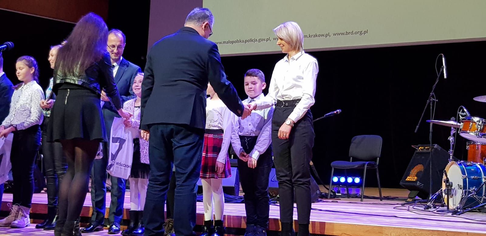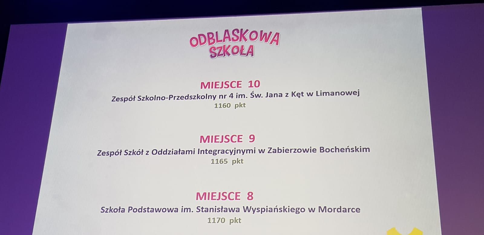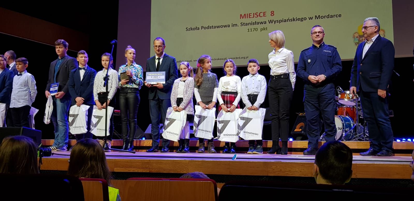 Uroczysta gala będąca podsumowaniem IX edycji konkursu „Odblaskowa Szkoła” odbyła się 10 grudnia br. w Centrum Kongresowym ICE w Krakowie. W wydarzeniu uczestniczyły szkoły, które osiągnęły najlepsze wyniki, w tym delegacja Szkoły Podstawowej w Mordarce: dyrektor szkoły Paweł Ciuła, koordynator akcji Barbara Lisek oraz uczniowie Zuzanna Jasica, Nikola Kuzar, Iwona Kaim, Bartosz Szubryt. Laureaci pierwszej dziesiątki otrzymali nagrody pieniężne oraz dyplomy.