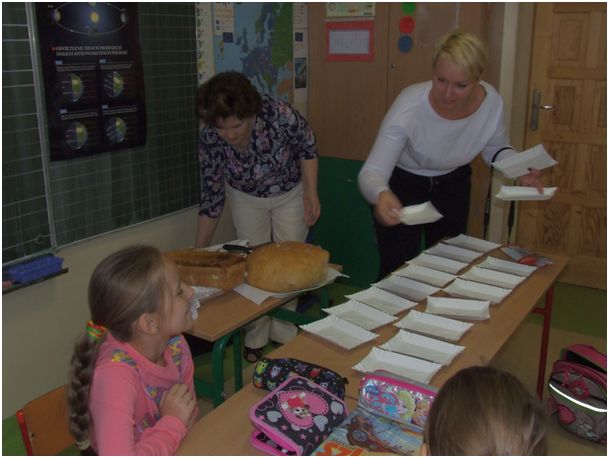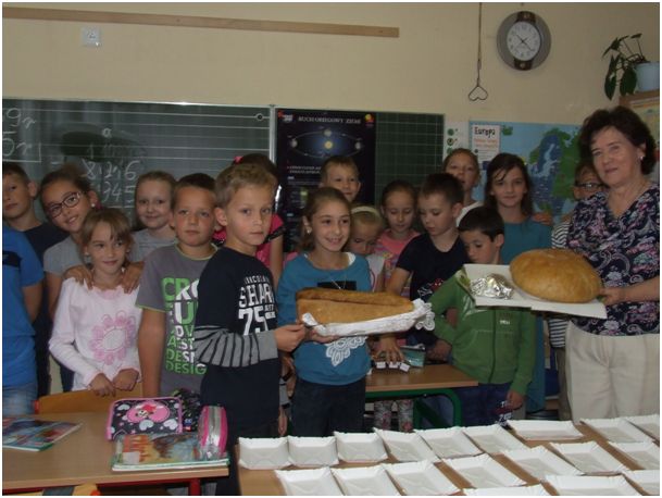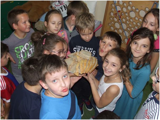 Wspominała też ciekawe historie ze swojego dzieciństwa, życia dorosłego i bycia babcią. Niezwykle zainteresowała dzieci swoimi opowieściami. Słuchały, ale zadawały też sporo pytań, chcąc jeszcze więcej się dowiedzieć. Ogromnie ucieszył ich widok i zapach świeżo upieczonego chleba, którym Babcia Józefa ich częstowała, smarując go domowym masłem i powidłem. Zajadali się i zachwycali smakiem. Każdy zabrał jeszcze kromkę tego chleba do domu, żeby podzielić się nim z bliskimi. Były także wspólne zabawy ze śpiewem i chustą. To była ciekawe i pouczające i radosne spotkanie. Dziękujemy.
