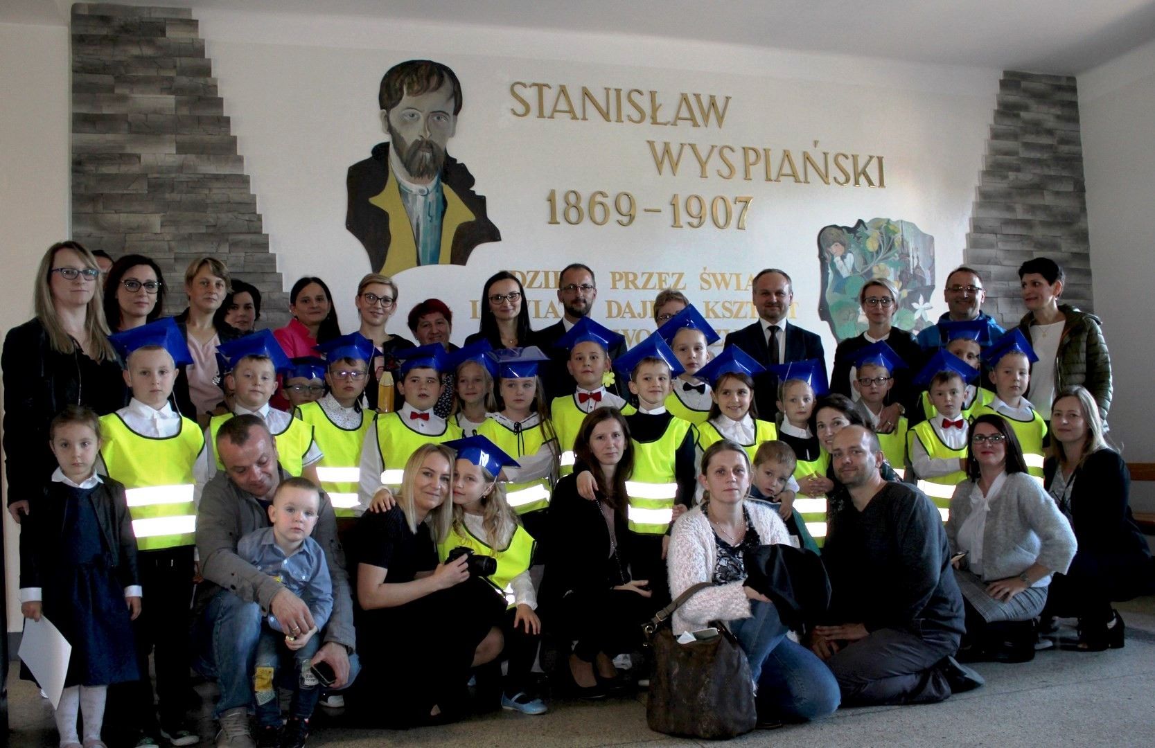 Na koniec uroczystości pan Jan Skrzekut oraz pani Edyta Król wraz z najlepszymi życzeniami wręczyli uczniom między innymi „kamizelki odblaskowe”, aby każdego dnia świecili przykładem nie tylko wzorowego ucznia, ale również wzorowego uczestnika ruchu drogowego. Następnie była chwila na pamiątkowe zdjęcia i słodki poczęstunek połączony ze spotkaniem z rodzicami uczniów, na którym również poruszono tematykę bezpieczeństwa. Ponadto po uroczystości „ Ślubowania” z okazji obchodzonego Dnia Edukacji Narodowej uczniowie zamiast tradycyjnych kwiatów w tym dniu, wręczyli nauczycielom samodzielnie wykonane „odblaskowe kwiatuszki”, aby mogli być dobrze widoczni na drodze i świecić nie tylko na niej, ale także świecić przykładem w oczach swoich wychowanków.