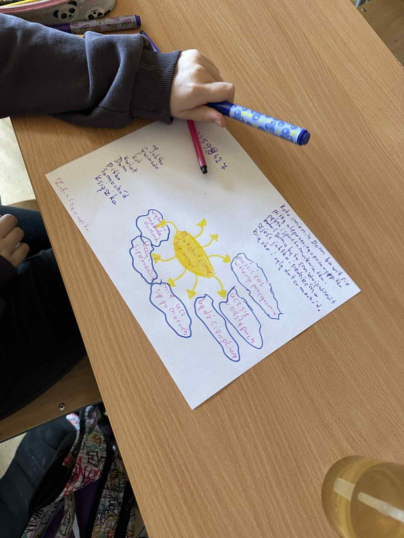 Podczas zajęć uczniowie tworzyli mapę myśli na podstawie lektury uzupełniającej „Ania z Zielonego Wzgórza”. Pracując z tekstem, porządkowali najważniejsze informacje dotyczące bohaterów, wydarzeń, miejsc oraz cech głównej postaci. Dzięki tej metodzie uczyli się selekcjonować informacje, dostrzegać związki między nimi oraz zapamiętywać treści w sposób wizualny i uporządkowany.