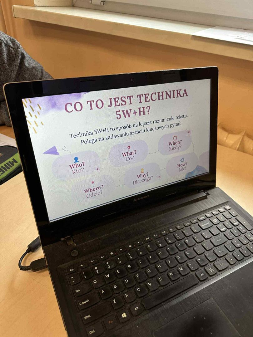 Uczniowie poznali technikę zadawania pytań 5W+H (Who? What? When? Where? Why? How?). Po zapoznaniu się z prezentacją pokazującą działanie 5W+H, analizowali fragment tekstu popularnonaukowego, stosując sześć kategorii pytań. Doszli do wniosku, że odpowiednie pytania pomagają w lepszym zrozumieniu tekstu, zadania lub problemu.