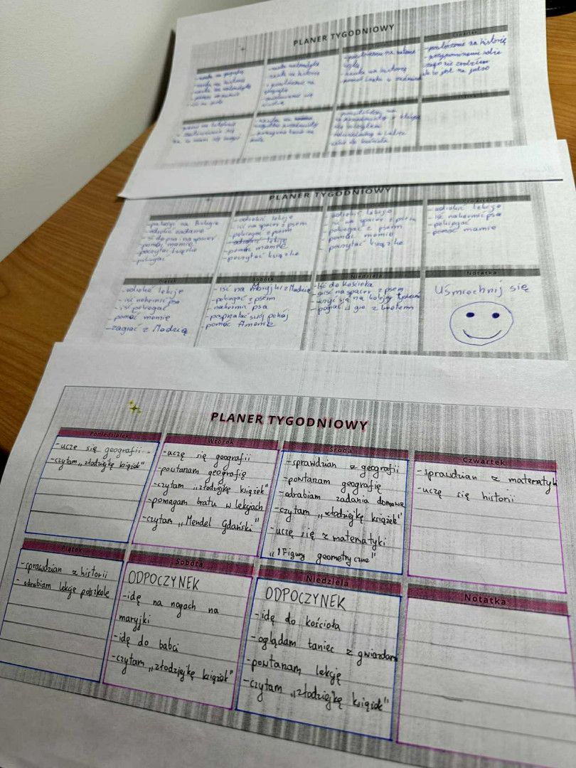 Uczniowie poznali podstawowe zasady planowania tygodnia nauki, zarządzania czasem i rozpisywania celów. Chętni układali własny mini-plan tygodniowy w oparciu o technikę priorytetów. Zastanawiali się, co najbardziej przeszkadza w nauce i jak można temu przeciwdziałać.