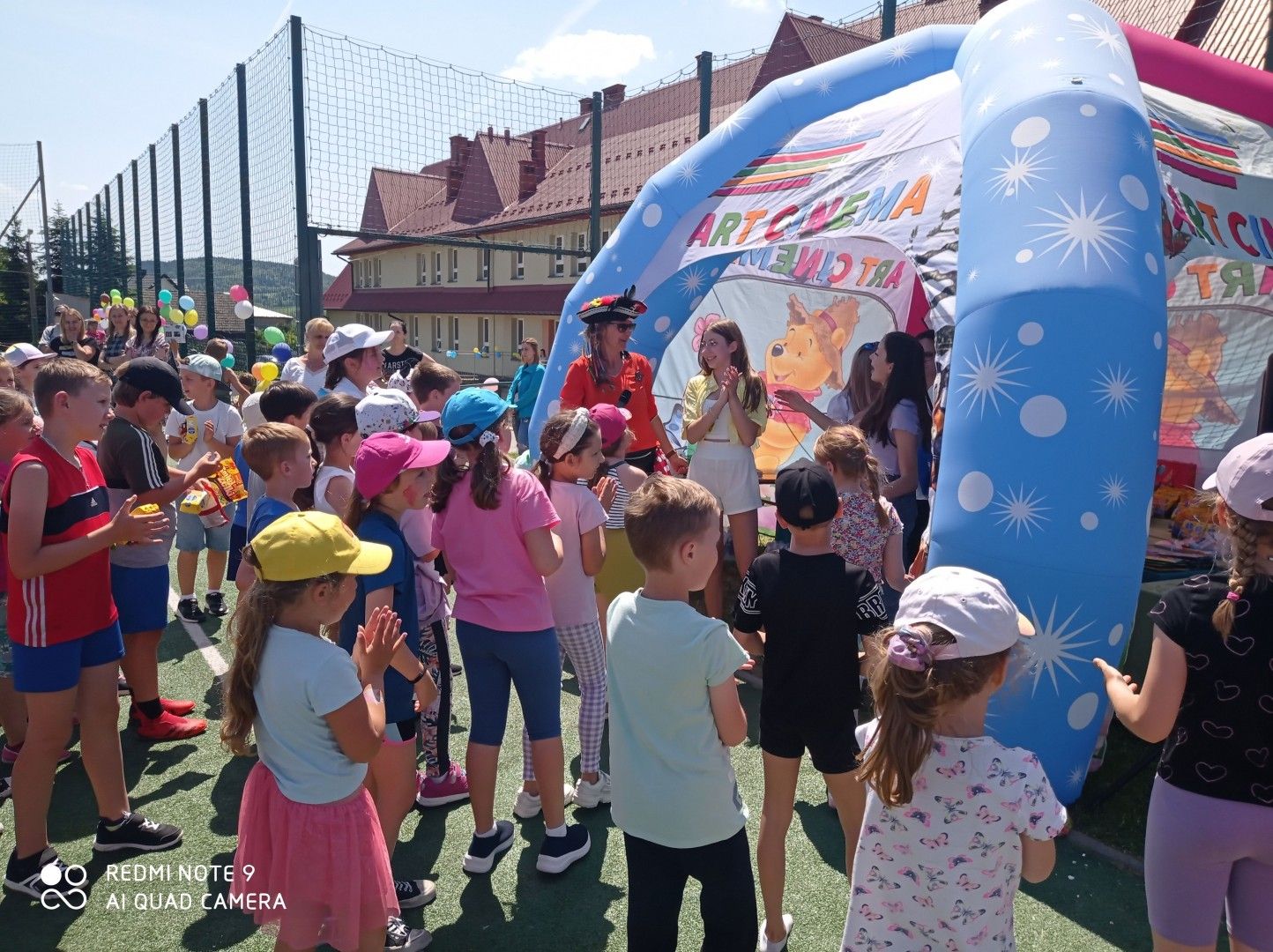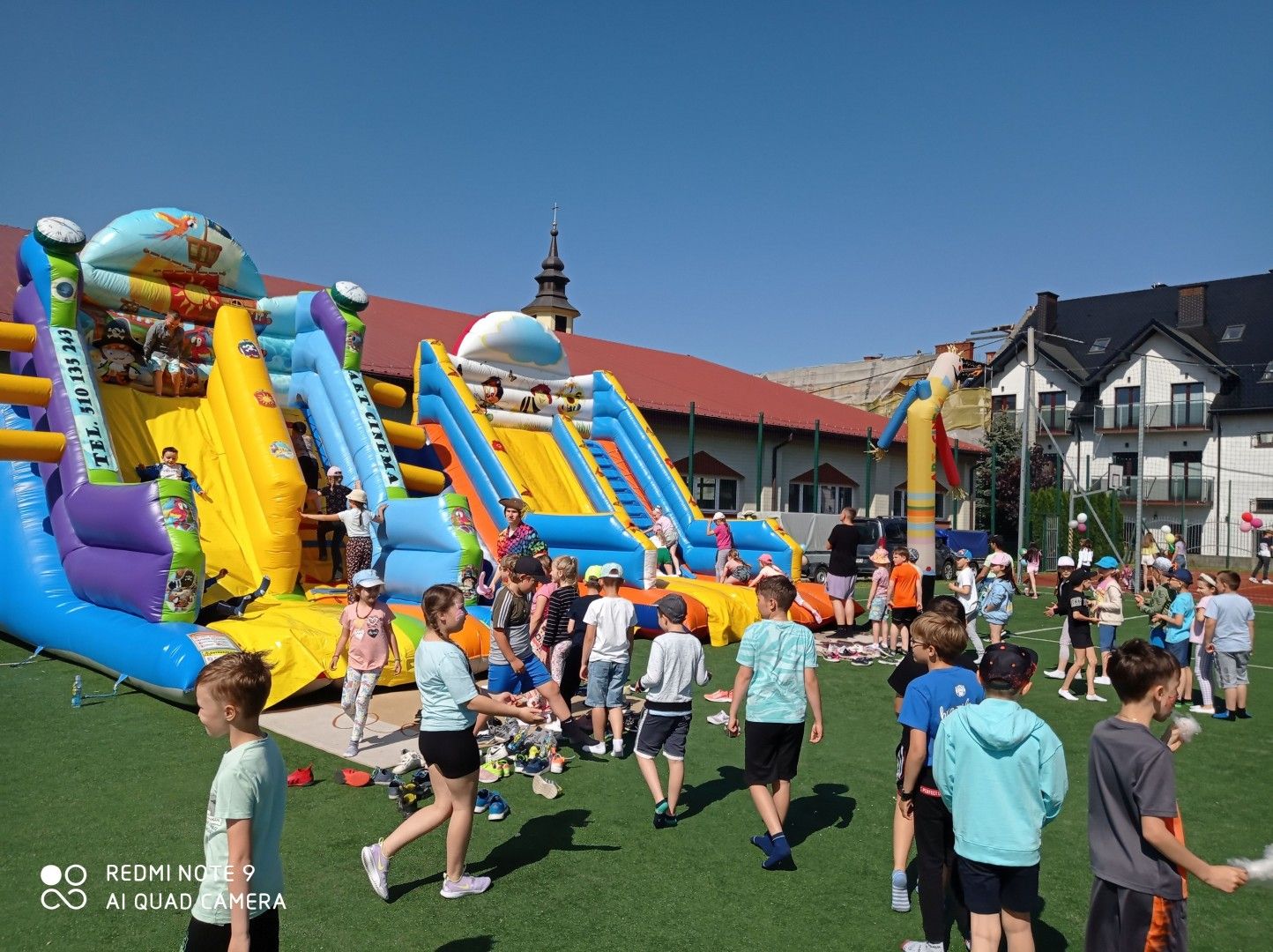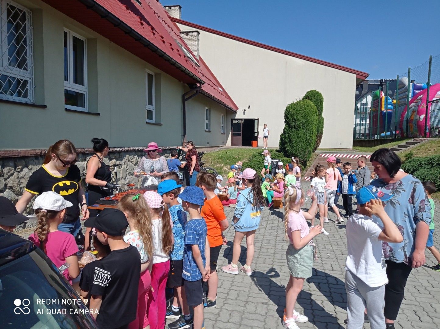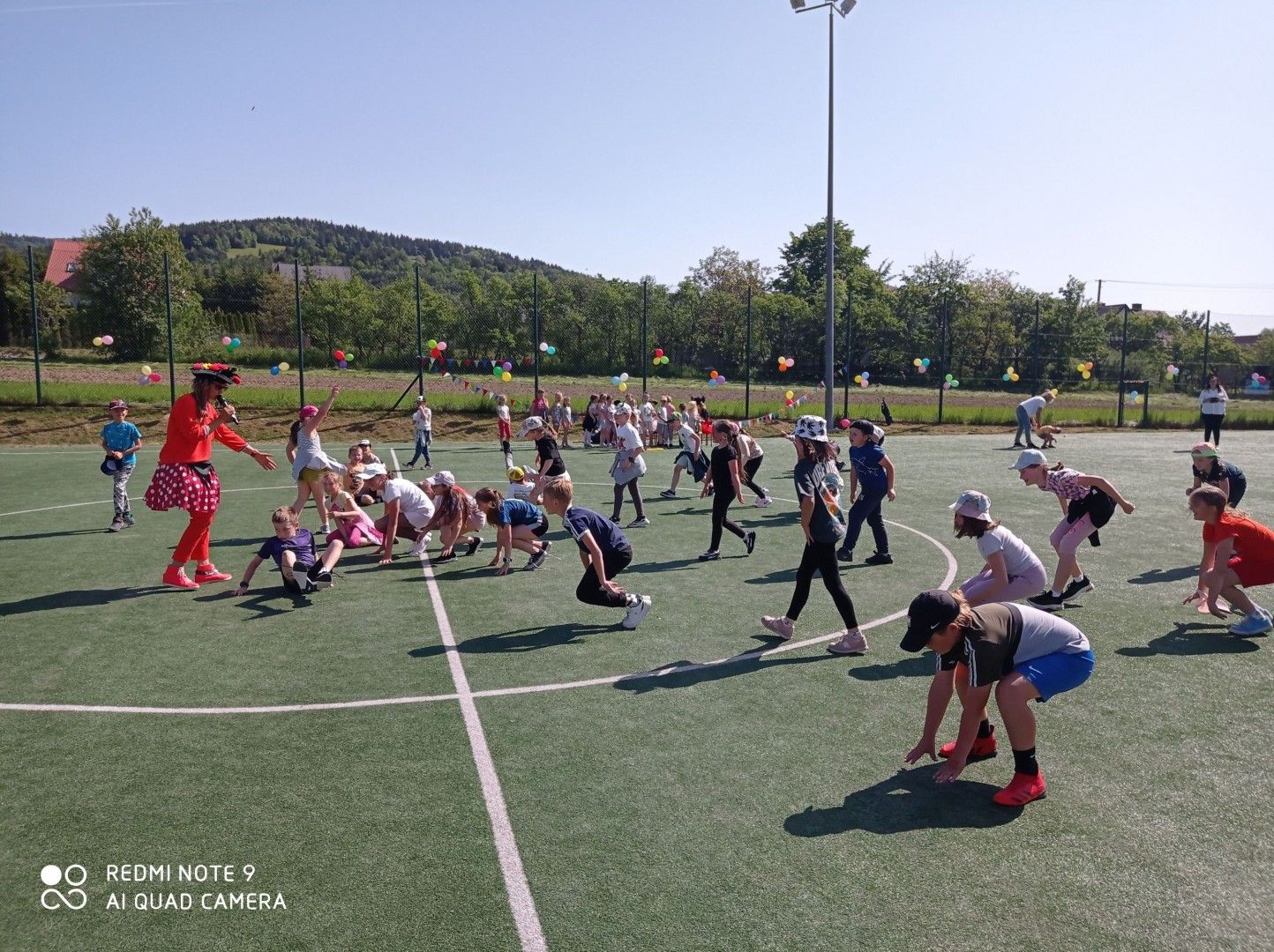 Dzień 1 czerwca, czyli Dzień Dziecka uczniowie z klas IV-VIII również spędzali aktywnie na świeżym powietrzu. Dzieci i młodzież sprawdzała swoje umiejętności między innymi w biegu przez płotki czy w rzucie do kosza. Każda klasa stworzyła swoją flagę! Odbył się również turniej siatkówki. Ogromnym zainteresowaniem jednak cieszyła się baloniada! Natomiast Rada Rodziców działająca w naszej szkole przygotowała dla uczestników imprezy smacznego grilla, ale nie zabrakło również smakołyków w postaci lodów i ciasteczek! Zabawa była świetna!