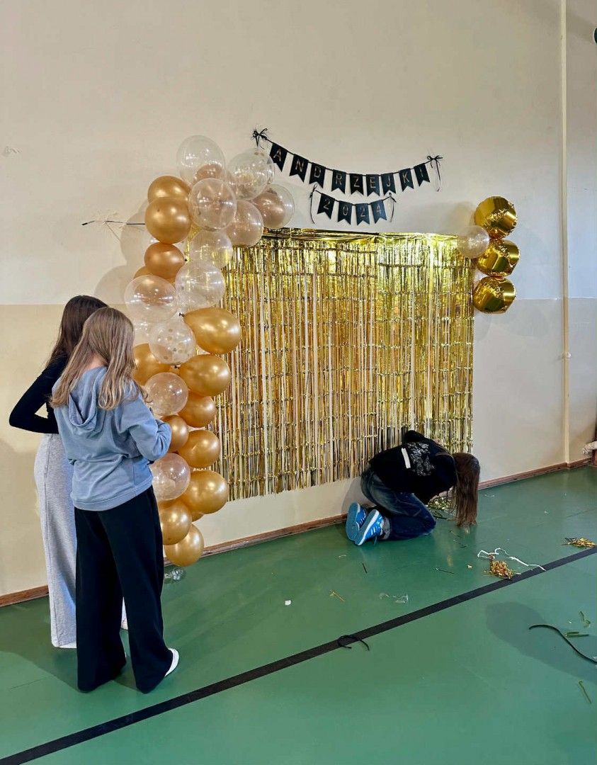 - Dyskoteka andrzejkowa – organizacja zabawy dla klas 4–8, w tym przygotowanie wyjątkowej ścianki z balonów, na której uczniowie mogli wykonywać sobie pamiątkowe zdjęcia. Zrobiliśmy plakat promujący zabawę oraz ogłosiliśmy konkurs na najlepsze przebranie. Opiekun przygotował dla zwycięzców talony na „dzień bez pytania”.