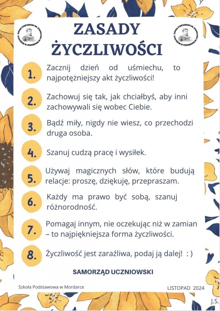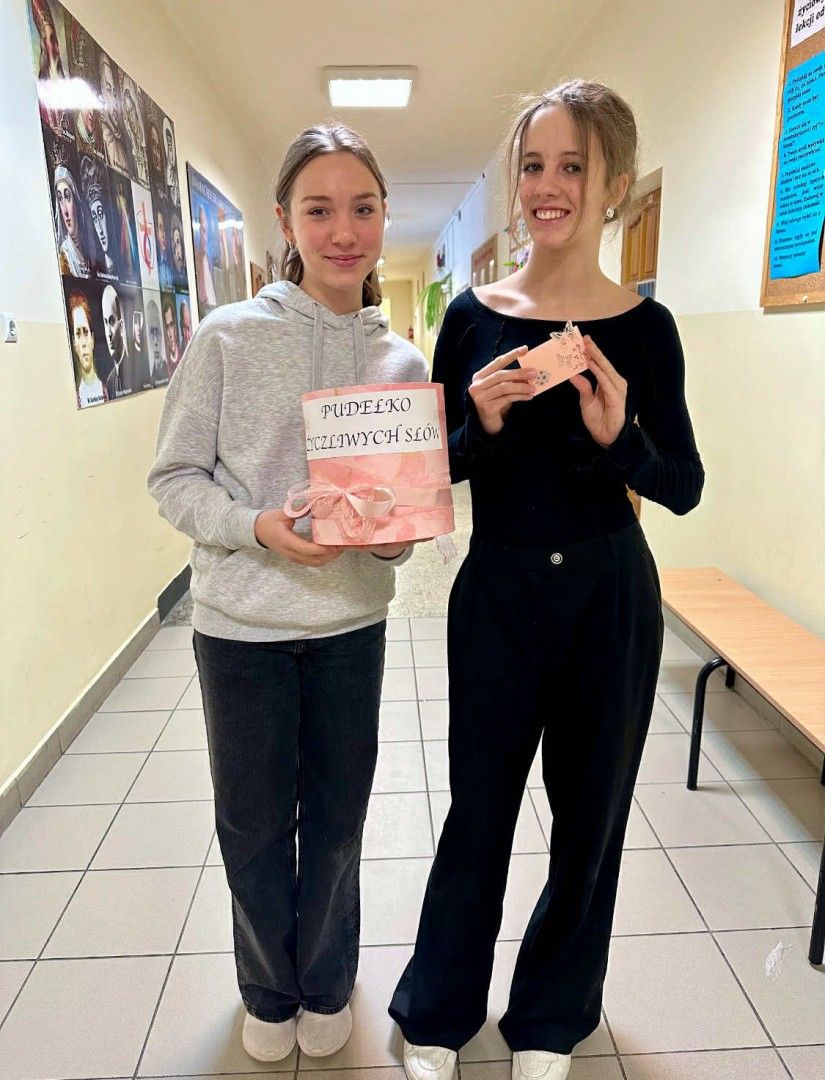 - Dzień Życzliwości - Swoje działania rozpoczęliśmy od stworzenia plakatu z ośmioma zasadami życzliwości. Następnie zainicjowaliśmy akcję „Pudełko życzliwych słów”. Młodzież z klas 4-8 mogła wylosować życzliwe hasło. Dla uczniów z klas 1-3 przygotowaliśmy naklejki z motywującymi słowami, które później zostały wklejone do ich zeszytów lekcyjnych. Z kolei dzieciom z oddziałów zerowych rozdaliśmy kolorowanki z życzliwymi hasłami i obrazkami, które w następnej kolejności zostały pięknie przyozdobione. Dodatkowo wykonaliśmy i obdarowaliśmy kartkami z aforyzmami o życzliwości wszystkich pracowników szkoły.