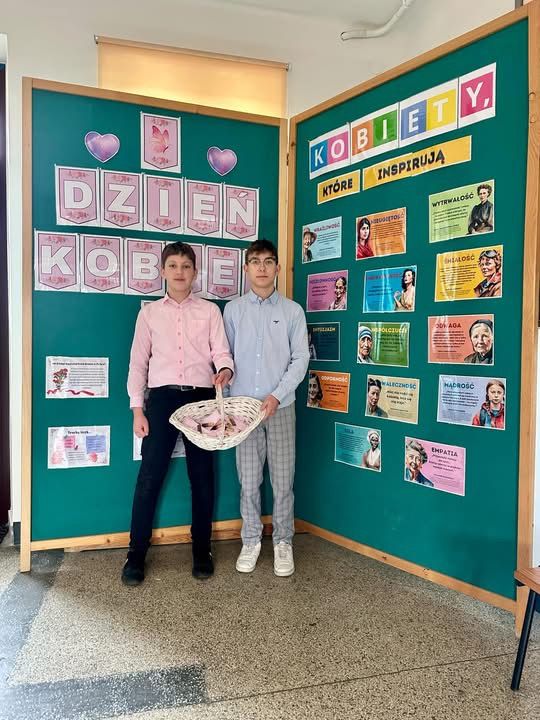 - Dzień Kobiet – wykonanie gazetki na głównym korytarzu szkoły „Kobiety, które inspirują”. Pomoc przy upominkach.
