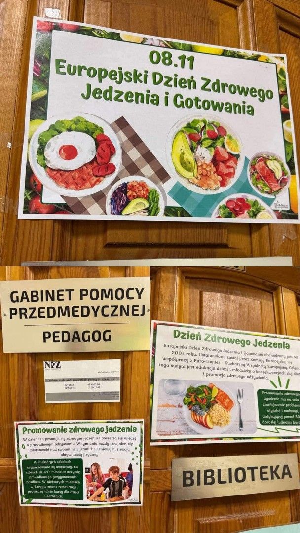 - Europejski Dzień Zdrowego Jedzenia i Gotowania – edukacja w zakresie zdrowego stylu życia poprzez przygotowanie zdrowych przekąsek. W ramach wydarzenia uczniowie przygotowali tematyczne gazetki, które zostały rozwieszone po całej szkole, zorganizowaliśmy akcję pt. „Przynieś zdrową przekąskę do szkoły”, a na naszej tablicy zwiesiliśmy piramidę żywienia.