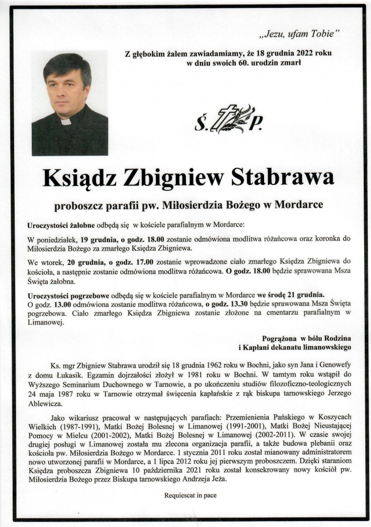 Z głębokim bólem i żalem informujemy, że w dniu 18 grudnia 2022r. odszedł do wieczności ksiądz Zbigniew Stabrawa. Od roku 2002 pełnił funkcję katechety w naszej szkole. Od samego początku pracę katechety łączył z obowiązkami budowniczego kościoła. Ponadto od roku 2012 funkcję nauczyciela religii łączył z obowiązkami Proboszcza Parafii pod wezwaniem Miłosierdzia Bożego w Mordarce. Dla nas jednak zawsze był przede wszystkim dobrym i serdecznym kolegą z pracy, a dla wszystkich uczniów ukochanym nauczycielem religii.