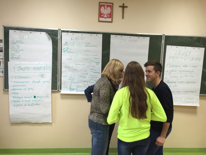 W ostatnich latach szczególną nadzieję wiąże się z rozpowszechnieniem idei mediacji rówieśniczych. Nasze gimnazjum jest jedyną szkołą w powiecie, w której działa spora grupa profesjonalnie przeszkolonych mediatorów rówieśniczych. Warsztaty odbyły się również w ramach projektu "Jak być wolnym od uzależnień" realizowanego przez Katolickie Centrum Edukacji Młodzieży "Kana" przy wsparciu finansowym Województwa Małopolskiego, zakończone egzaminem były prowadzone przez doświadczonego pedagoga i edukatora Panią mgr H. Czerwińską- trenera fundacji Ostoja. Przeszkoleni uczniowie, przy aktywnym wsparciu przygotowanych nauczycieli i rodziców, pomagają swoim kolegom dochodzić do porozumienia w ewentualnych sporach i przejmować przez nich odpowiedzialność za to porozumienie. Korzyści wychowawcze, jakie uzyskujemy w procesie mediacji, są nie do przecenienia. Jest ona bowiem bezpiecznym i skutecznym sposobem rozwiązywania konfliktów między uczniami.